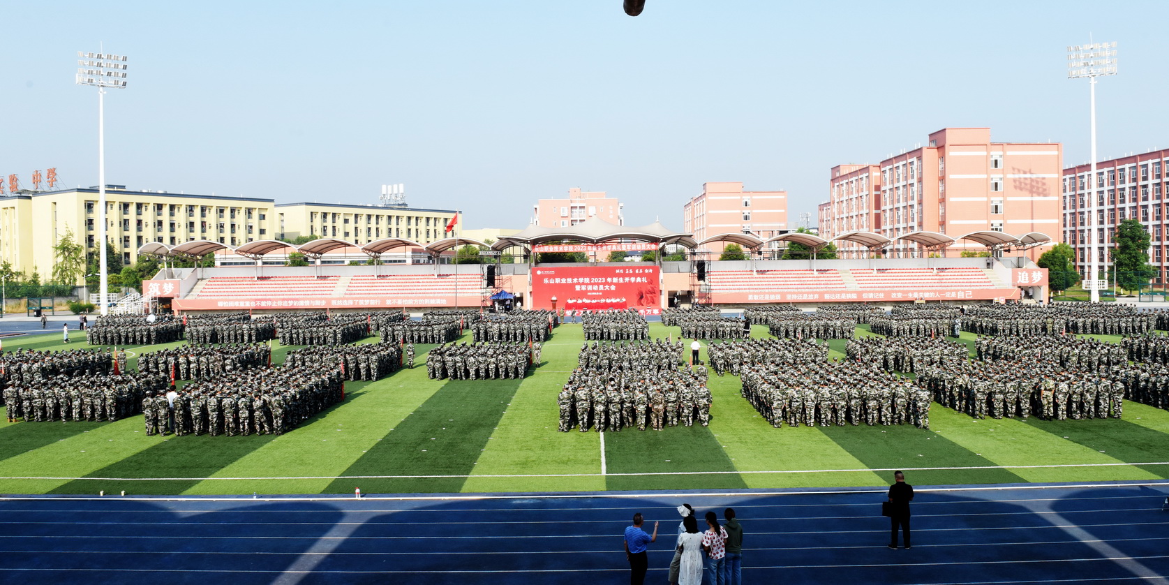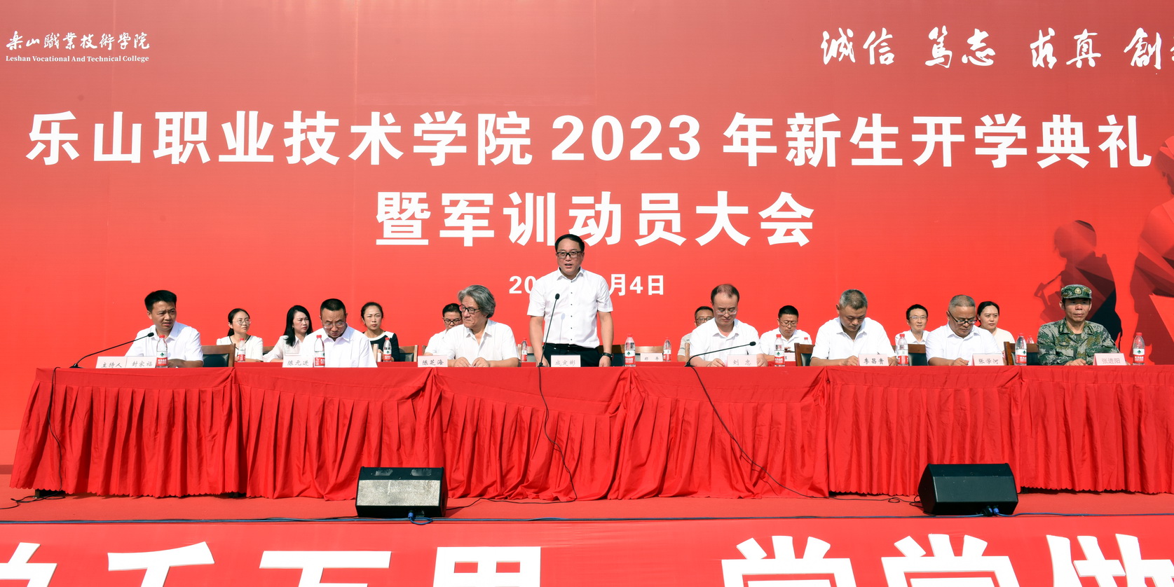 2023年9月4日上午,beat365亚洲版官网2023级新生开学典礼暨军训动员大会在学校体育场隆重举行。全体校领导、各二级学院党总支书记、专职副书记、相关职能部门负责人、新生班级辅导员、军训带训干部、教官及全体2023级新生参加大会。大会由校党委委员、副校长封家福主持。