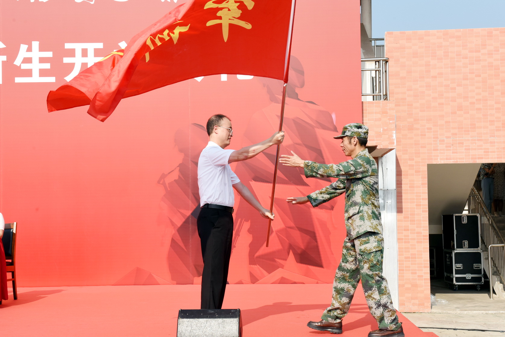 最后,刘忠为军训团执行团长张进阳授军训旗,成定彬宣布“2023级新生军训正式开始”。