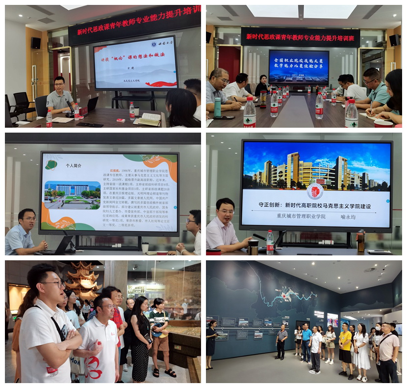 本次培训以新时代思政课青年教师专业能力提升为主题,分四个阶段进行。培训前,陈元进明确了培训目的、强调了培训要求,思政教师徐红梅代表全体参培人员作了表态发言。培训期间,参培教师聆听了西南大学马克思主义学院方建副教授的《“概论”课教学改革与专题实例分享》专题讲座,与重庆城市管理职业学院张燕霞、李尚伦、江优优等优秀教师进行了思政课教学改革、教师教学能力比赛、科研能力提升等经验交流,听取了重庆城市管理职业学院宣传部部长喻永均《新时代马克思主义学院建设》专题讲座,并参观该校“红色记忆”研学基地,到重庆渣滓洞白公馆、重庆三峡博物馆和西部物流园开展红岩精神、乡村振兴、“一带一路”的实践教学。