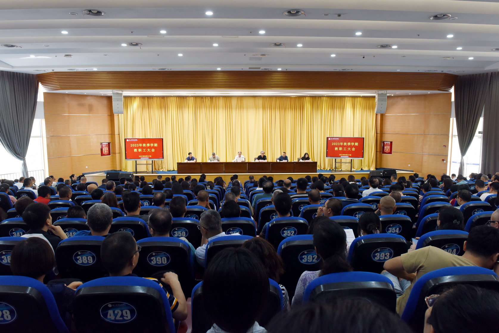 8月27日上午,2023年秋季学期教职工大会在图书馆学术报告厅召开。校长刘忠,党委副书记、工会主席陈芝海,党委委员、纪委书记李昌贵,党委委员、副校长陈元进、封家福、周芹,全体中层干部、教职员工参加。会议由陈芝海主持。