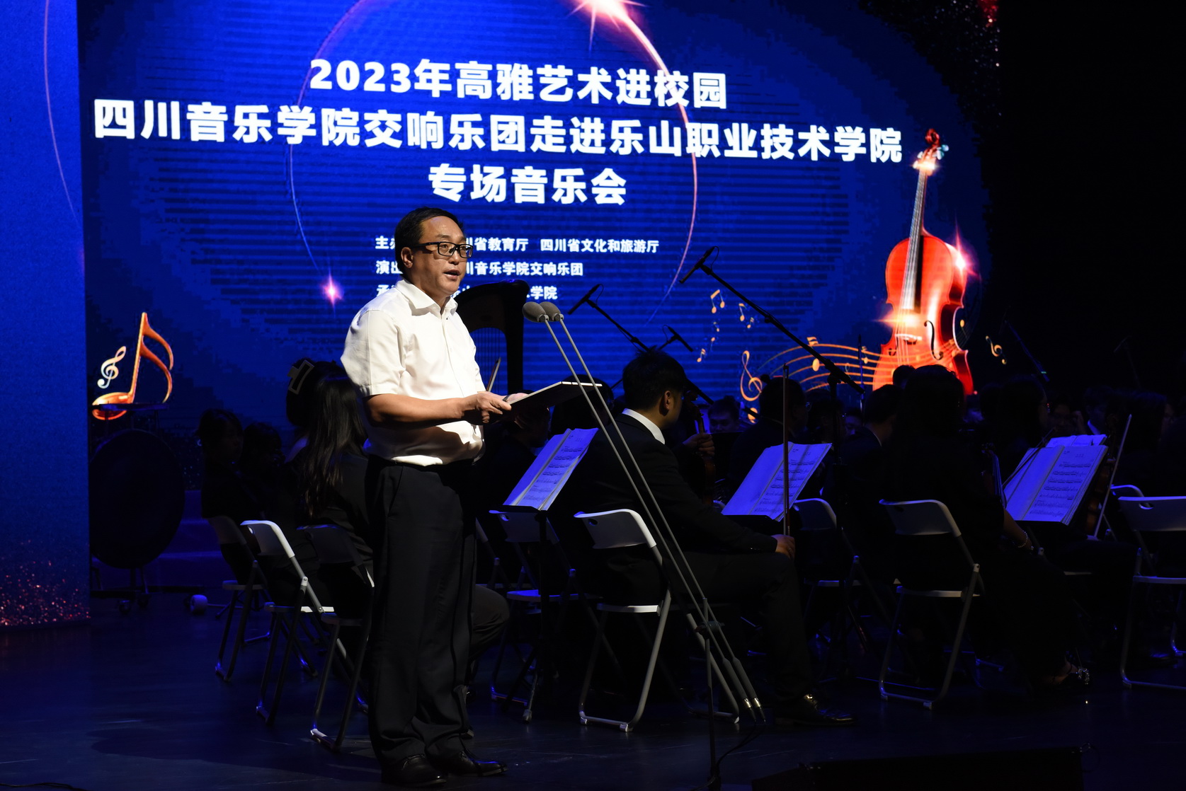 音乐传递精神,艺术沟通世界。2023年6月15日晚上7点,由四川省教育厅、四川省文化和旅游厅主办的“高雅艺术进校园——四川音乐学院交响乐团走进beat365亚洲版官网”专场音乐会,在学院礼堂成功举办。市委、市人大常委会、市政府、市政协有关领导,市级各部门和友好单位领导等校外嘉宾应邀与学院一千余名师生共同欣赏了这场音乐盛宴。学院党委书记成定彬致欢迎辞。