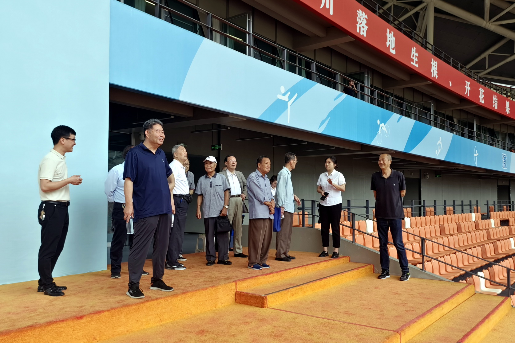 在奥林匹克中心工作人员的引领下,老干部们先后参观了主体育场、体育馆、游泳馆、综合训练馆。占地5万平方米的主体育场,红色跑道和绿色草坪交相辉映,数不胜数的橙棕白座椅交错有序,老干部们置身开阔的运动场地,仰望浩大的观众席,感慨场馆的气势恢宏,追忆省运会广大运动员和观众迸发出的豪迈热情。在体育馆、游泳馆、综合训练馆,老干部们认真聆听工作人员讲解,还兴趣盎然地了解了场地布置、功能、赛事项目等细节,深切体会团结向上、奋力拼搏、逐梦圆梦的体育精神。乐山奥林匹克中心浩大的场景震撼着老干部们,场馆洋溢的运动热情感染着老干部们。当工作人员介绍到奥林匹克中心的“山水嘉州”特殊设计意境时,老干部们更是连连称赞,感叹不已。