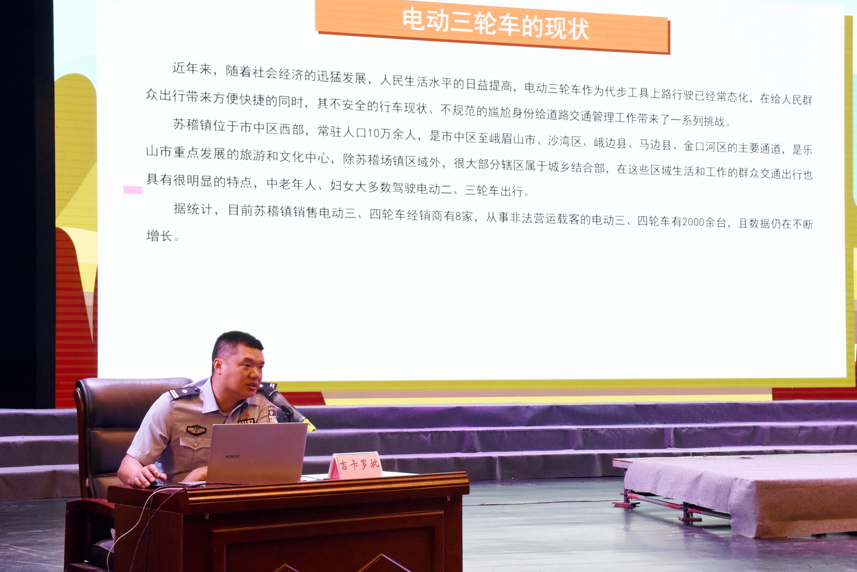 为增强大学生的交通安全意识,增强同学们自我保护能力。2023年5月31日下午,由学生工作部牵头、保卫处协办,在礼堂举办了“青江大讲堂:交通安全进校园 文明行驶在身边”交通安全专题讲座。讲座邀请乐山市公安局交警支队直属二大队苏稽中队吉卡罗批警官主讲,各二级学院专职副书记、专兼职辅导员和1500余名学生代表聆听演讲。