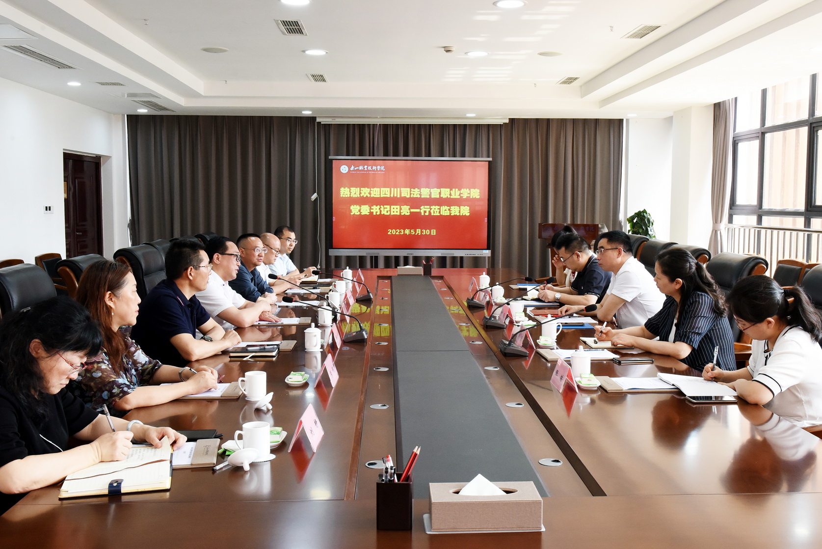 2023年5月30日上午,四川司法警官职业学院党委书记田亮,党委委员、副院长胡蓉及招生就业处相关人员一行5人莅临beat365亚洲版官网考察交流。交流座谈会在学术交流中心2001会议室进行,beat365亚洲版官网党委书记成定彬,党委委员、副校长陈元进,后勤处、学生工作部相关负责人参加了交流座谈会。