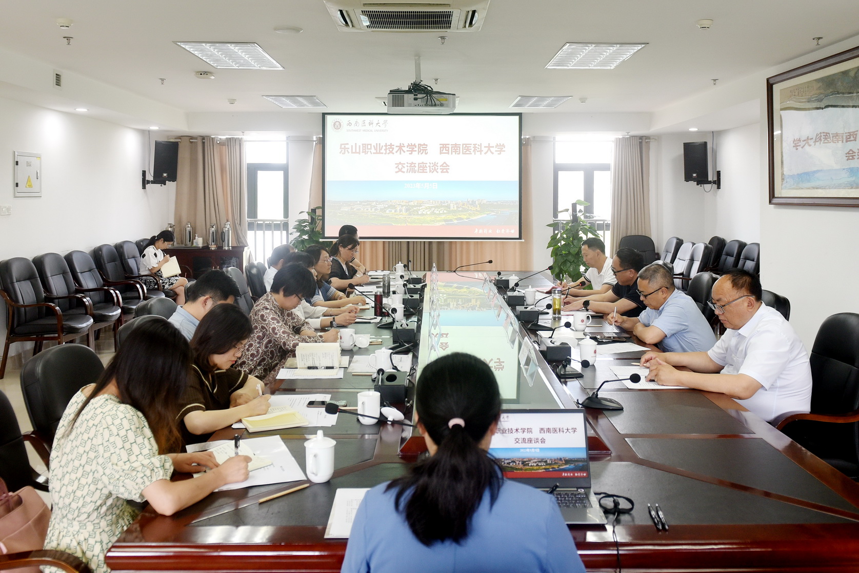 5月6日,成定彬一行来到西南医科大学,受到西南医科大学党委书记廖斌、副校长何涛以及相关部门负责人热情接待,并于下午召开了座谈会。成定彬介绍了学校的发展情况和此行到西南医科大学调研交流的目的,恳请西南医科大学在专业本科联合办学(药学、康复治疗技术)、教师学历提升、实训室建设、专家聘任等方面给予学校支持和帮助。围绕学校需求,双方在学科专业建设、本科层次联合办学、专升本工作、师资队伍建设、实训中心建设等方面开展了深入交流,并达成了初步意向。会后参观了西南医科大学临床技能中心和新建的附属口腔医院,附属口腔医院负责同志对beat365口腔医学生产性实训基地建设方案进行了指导并提出了宝贵意见。