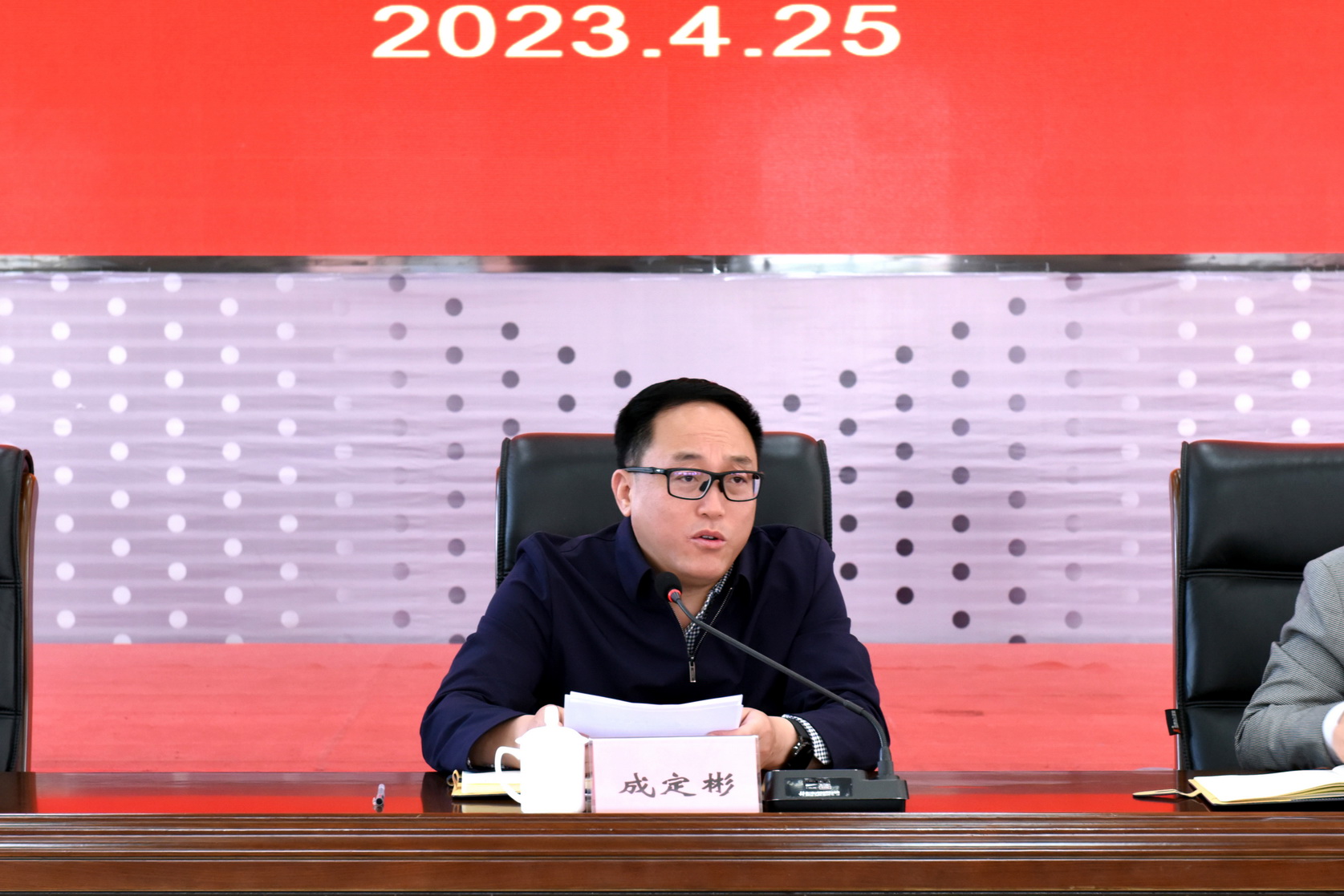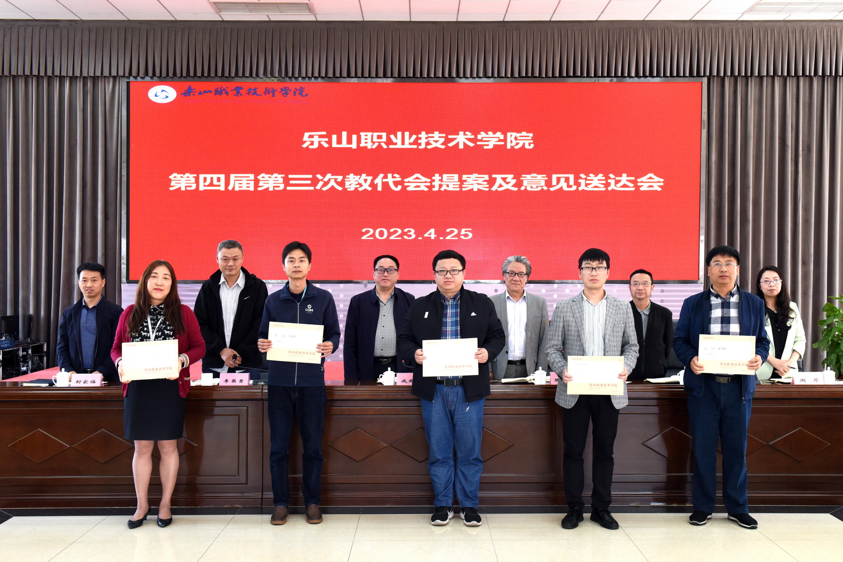 会上进行了提案送达交接仪式,陈芝海将10件提案送达给主承办部门,主承办部门负责人上台接受任务并与与会领导合影留念。