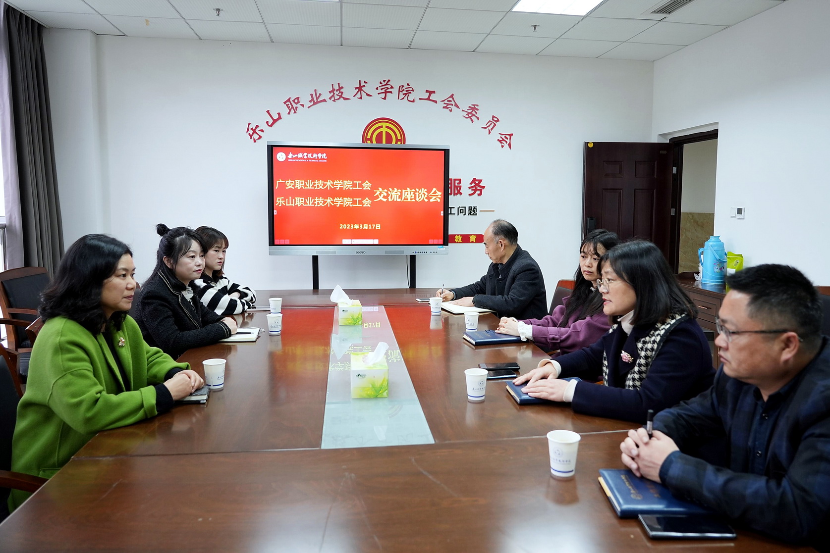3月17日上午,广安职业技术学院工会副主席、妇联主席刘春红一行4人,来beat365开展工作交流。座谈会在行政楼402会议室举行,学院工会副主席黄晓莉主持,全体工会干事参加座谈。