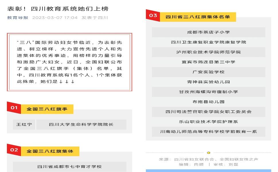 在“三八”国际妇女节来临之际,我院护理系荣获“四川省三八红旗集体”,马院姚佳秀老师荣获“全国最美家庭”。