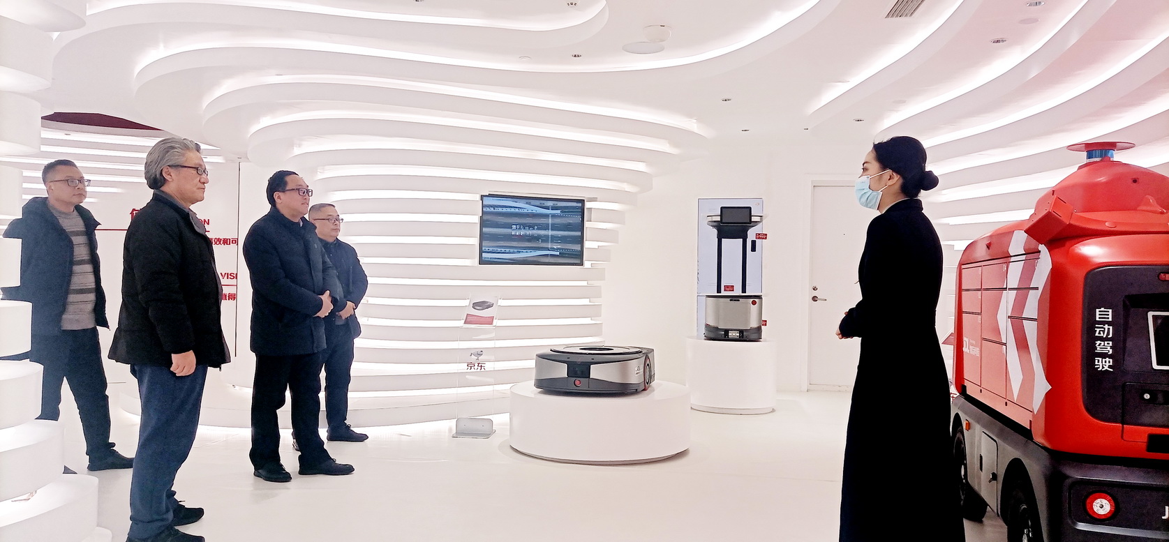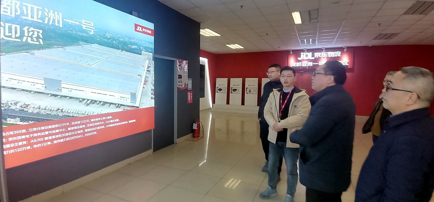 成定彬一行在京东西南区负责人金星星陪同下实地了解了京东电商西南区总体情况,京东物流亚洲一号仓运行情况以及学生实习就业情况。