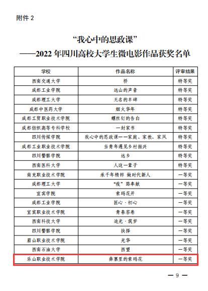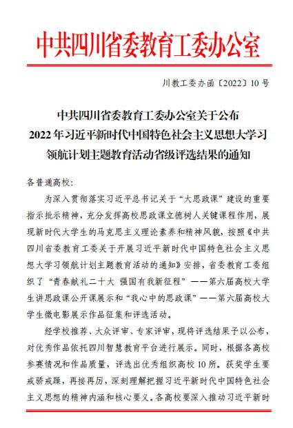 近日,四川省委教育工委组织的“青春献礼党的二十大 强国有我新征程”——第六届高校大学生讲思政课公开课展示和“我心中的思政课”——第六届高校大学生微电影展示作品征集和评选活动评选结果公布,beat365亚洲版官网报送的5个参赛作品分别获得特等奖1个、一等奖3个、二等奖1个,学院荣获“优秀组织高校”称号。