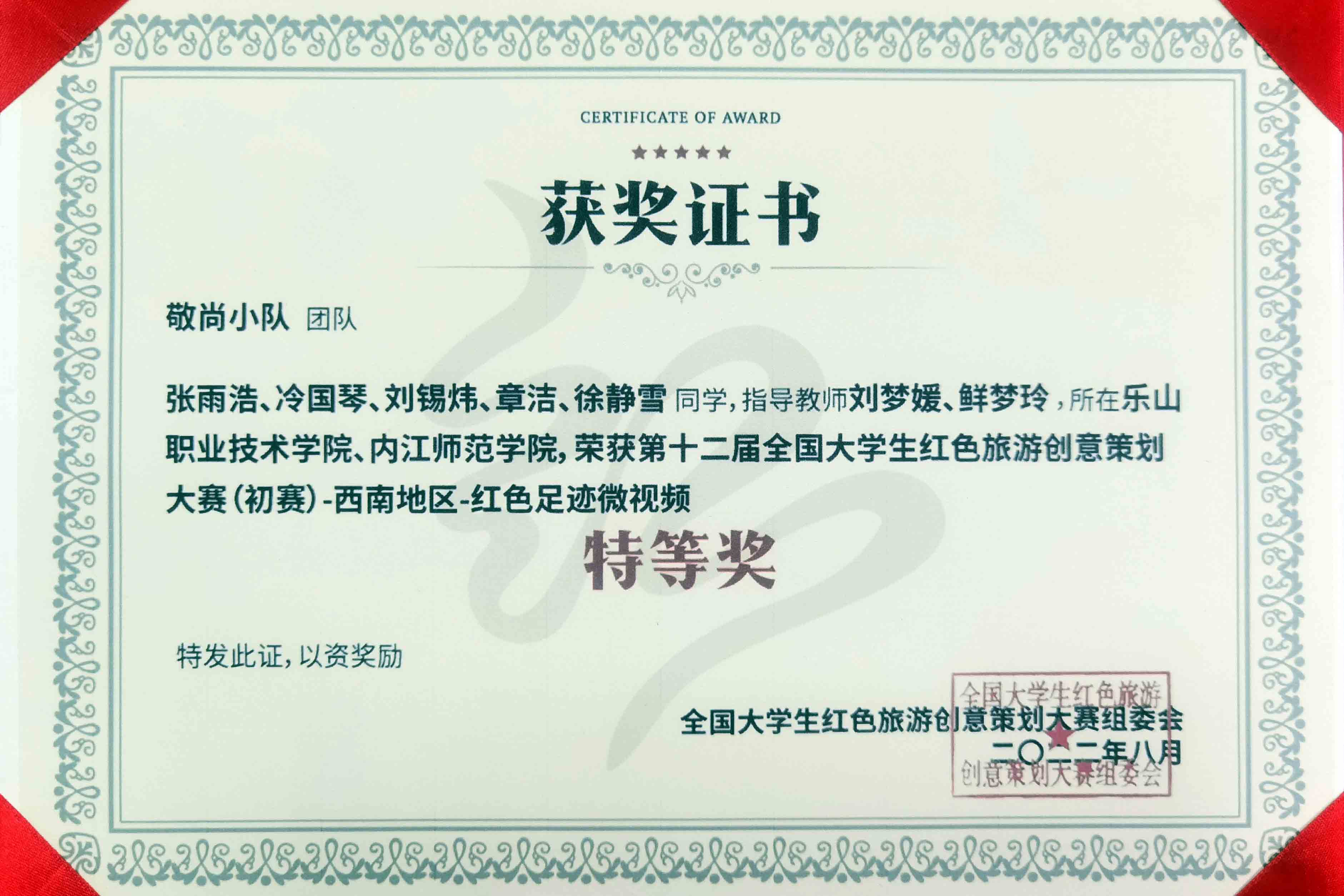 “敬尚小队”由beat365亚洲版官网旅游系旅游管理专业2021级学生张雨浩、冷国琴、刘锡炜、徐静雪,内江师范学院体育教育专业2021级学生章浩5名同学组成,在旅游系刘梦媛、鲜梦玲及马克思主义学院刘晓锐等老师的指导下,从今年7月初开始备赛,经历了“讨论策划→制定方案→视频脚本→延安采风→后期制作→完善资料→答辩排练”等过程,8月中旬形成了完整的参赛作品《勠力同心播火种 抗大精神在延安》微视频,在西南赛区“红色足迹微视频”赛道组荣获“特等奖”并进入全国总决赛。在全国总决赛中,最终取得“第十二届全国大学生红色旅游创意策划大赛-红色足迹微视频”二等奖的优异成绩,刘梦媛、鲜梦玲老师获得“最佳指导教师奖”的殊誉。