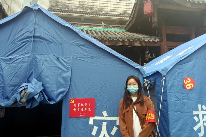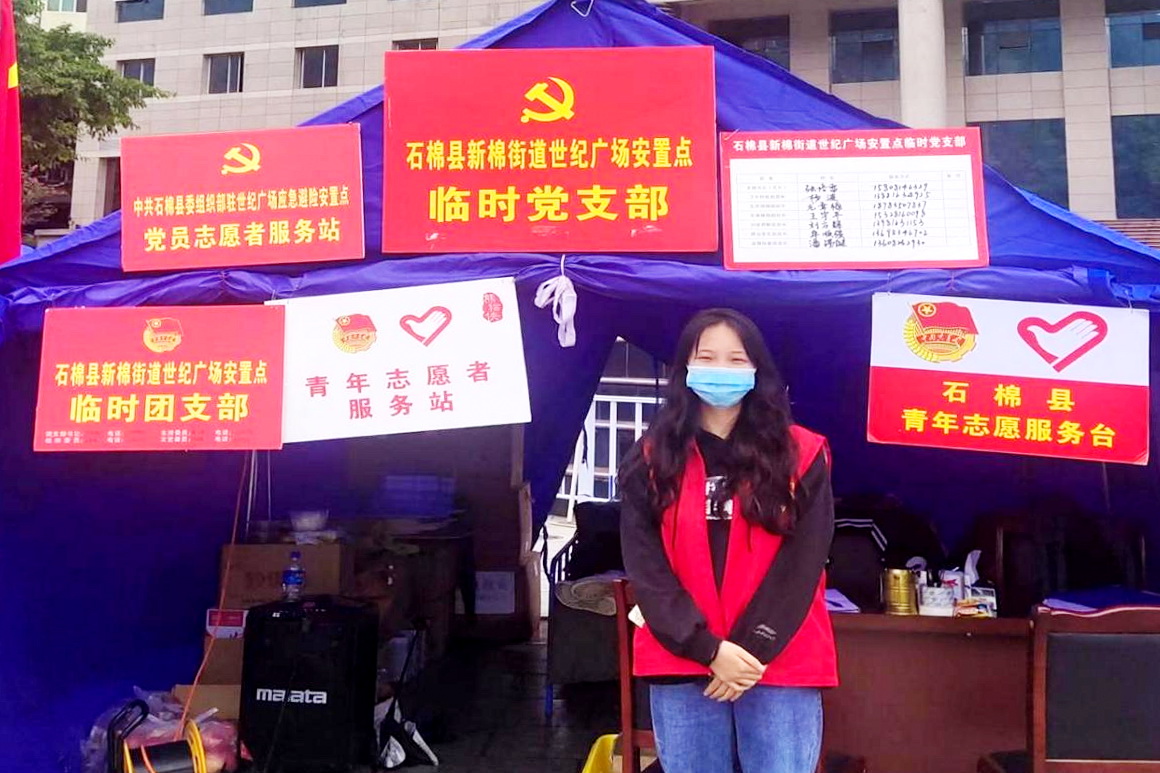 地震发生时,药学系农检专业的蹇元凤刚刚上完网课,取得父母同意后,她申请加入了志愿服务队,协助当地开展灾民安置、救援物资登记、发放,照顾受灾家庭小朋友。