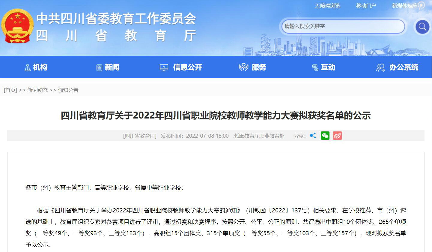 7月6日,2022年四川省职业院校教师教学能力大赛现场决赛在德阳落下帷幕。经过激烈的角逐,我院教师团队喜获一等奖3项、二等奖4项、三等奖2项,同时学院还获得“最佳组织奖”,为我院“双高计划”建设项目添上浓墨重彩的一笔。