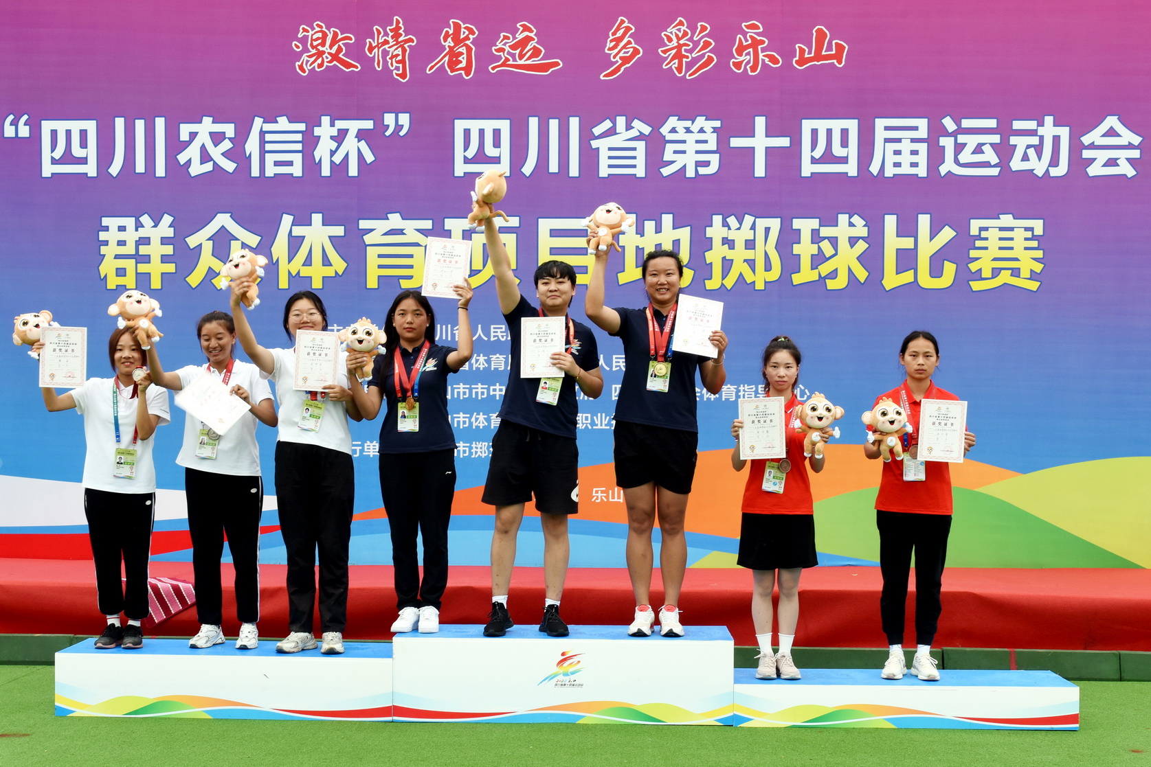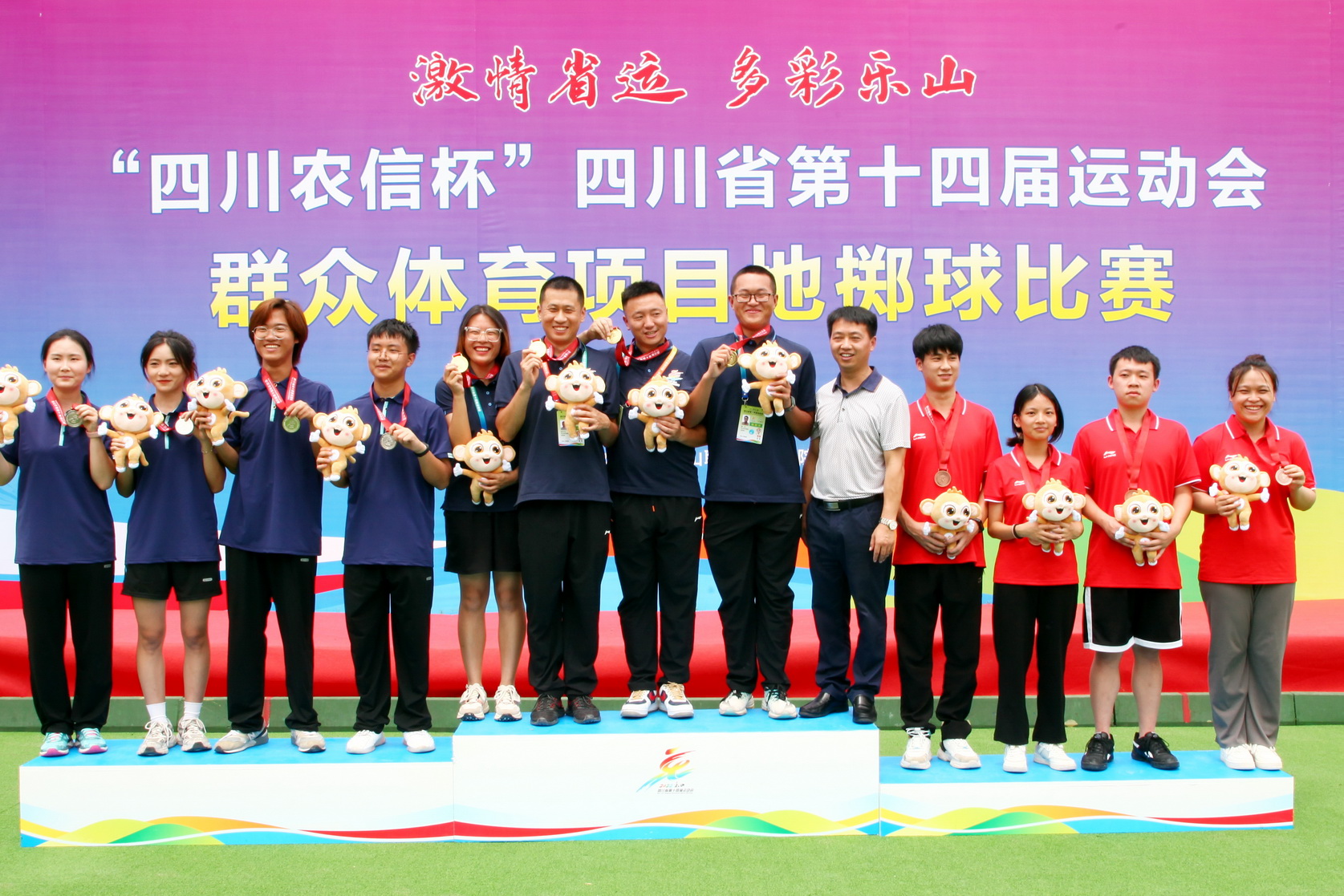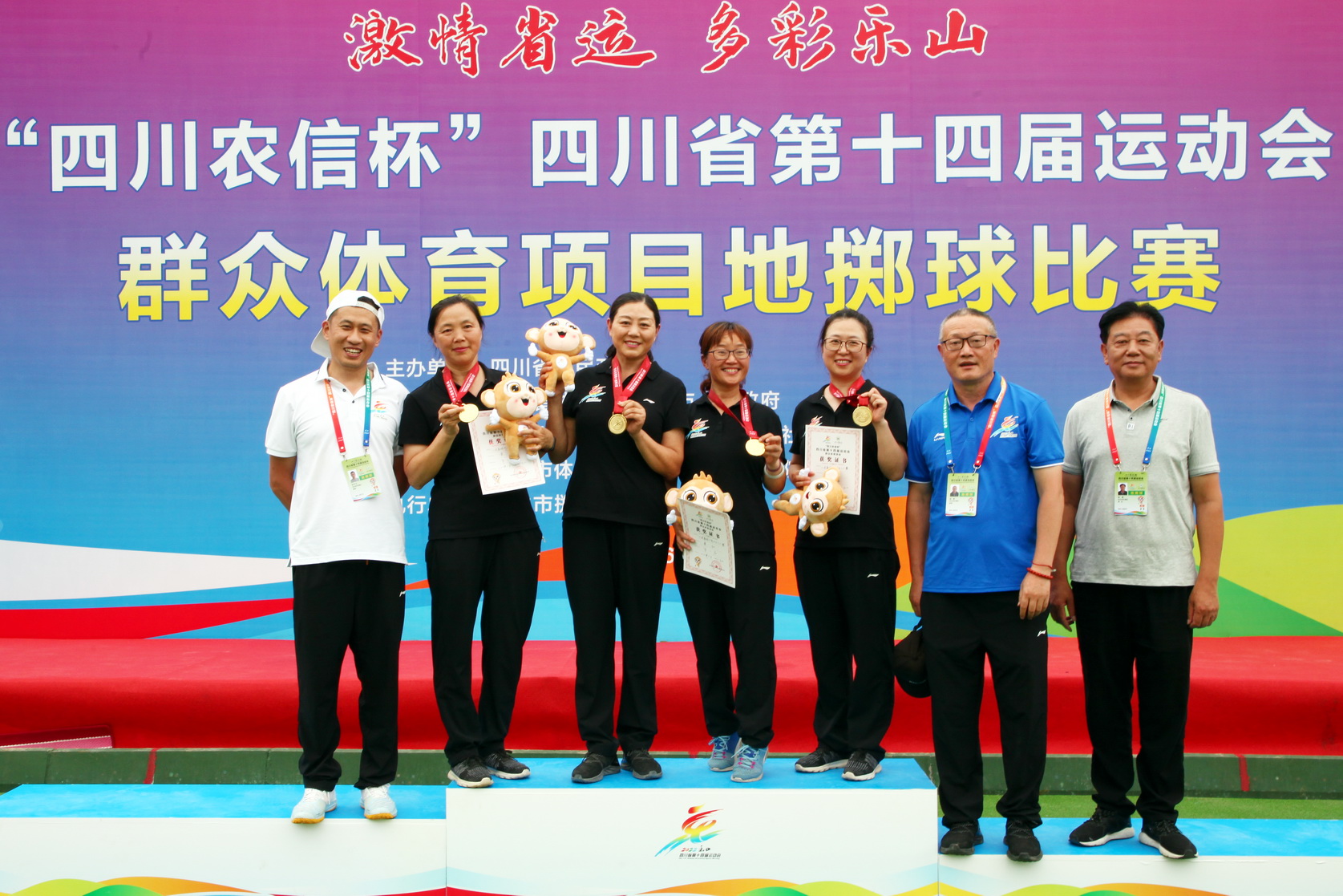 6月25日,在小金属球中年女子三人赛中,由乐职院教师姜腾东、黄梅、朱红、杨莉频四人组合参赛,在比赛中多次上演逆袭大戏,在比分6:9和2:8落后的情况下,发扬顽强拼搏的精神,最终以11:9和11:8的比分获得胜利,为乐山队夺得该项目第一金。