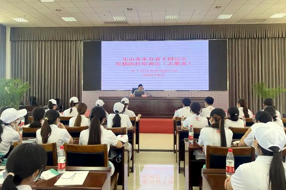 四川省第十四届运动会防疫医疗部雷霄老师进行疫情防控指引及应急培训,提出工作目标是要切实把好关口、以面保点、点面结合,坚持科学防控,精准防控,讲授了中暑应急处置,要求志愿工作人员,要相互协作,共同努力,助力省运。