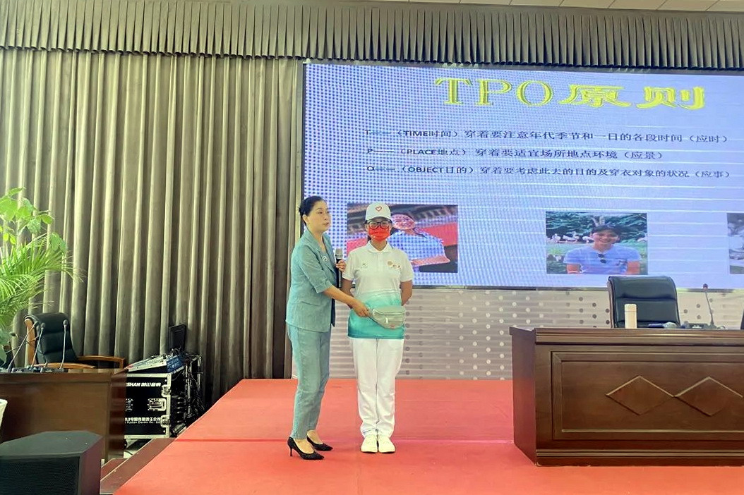 周晓红老师对志愿者进行省运会礼仪知识培训。她提到形象塑造的重要性,以及着装、仪态、站姿、引领手势要求,让志愿者们深化学习到礼仪知识。