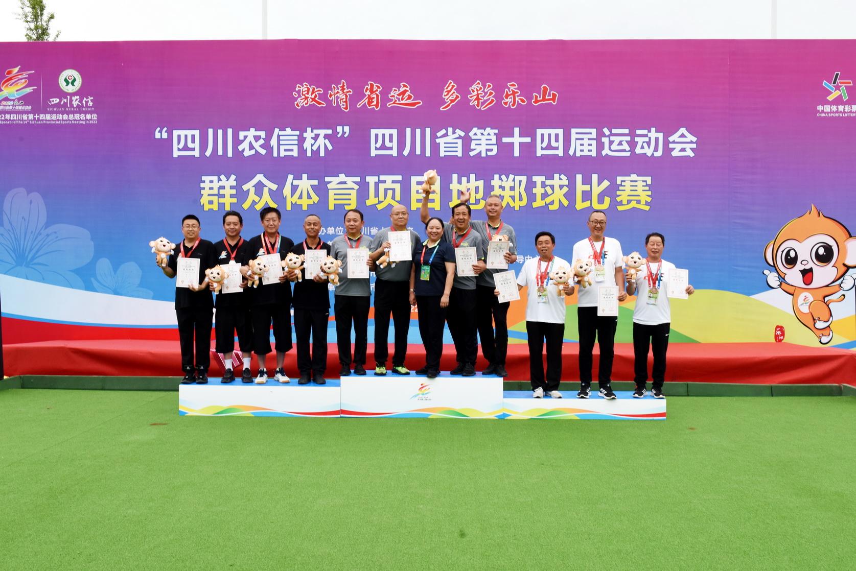 “草地掷球青年混合三人赛”第一名宜宾队、第二名乐山队、第三名雅安队,4-8名分别是南充、达州、攀枝花、广安和巴中代表队。