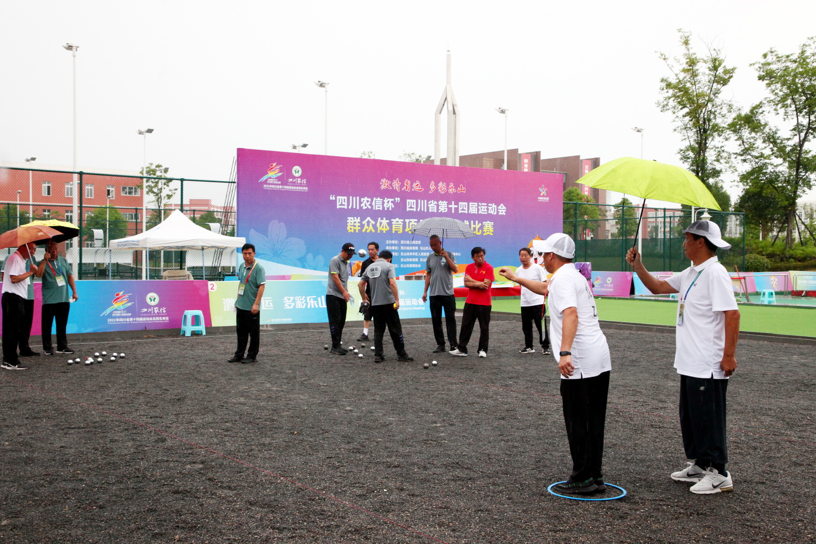 今日的赛程因受大风大雨天气影响,比赛顺延了两小时,部分比赛改到体育馆内备用场地进行,部分比赛时间也因此调整到了晚间举行,但是运动员们的比赛激情并未因风雨有丝毫减退,依旧热情高涨,有的甚至冒雨进行比赛,充分体现了“激情省运 多彩乐山”的省运风采。
