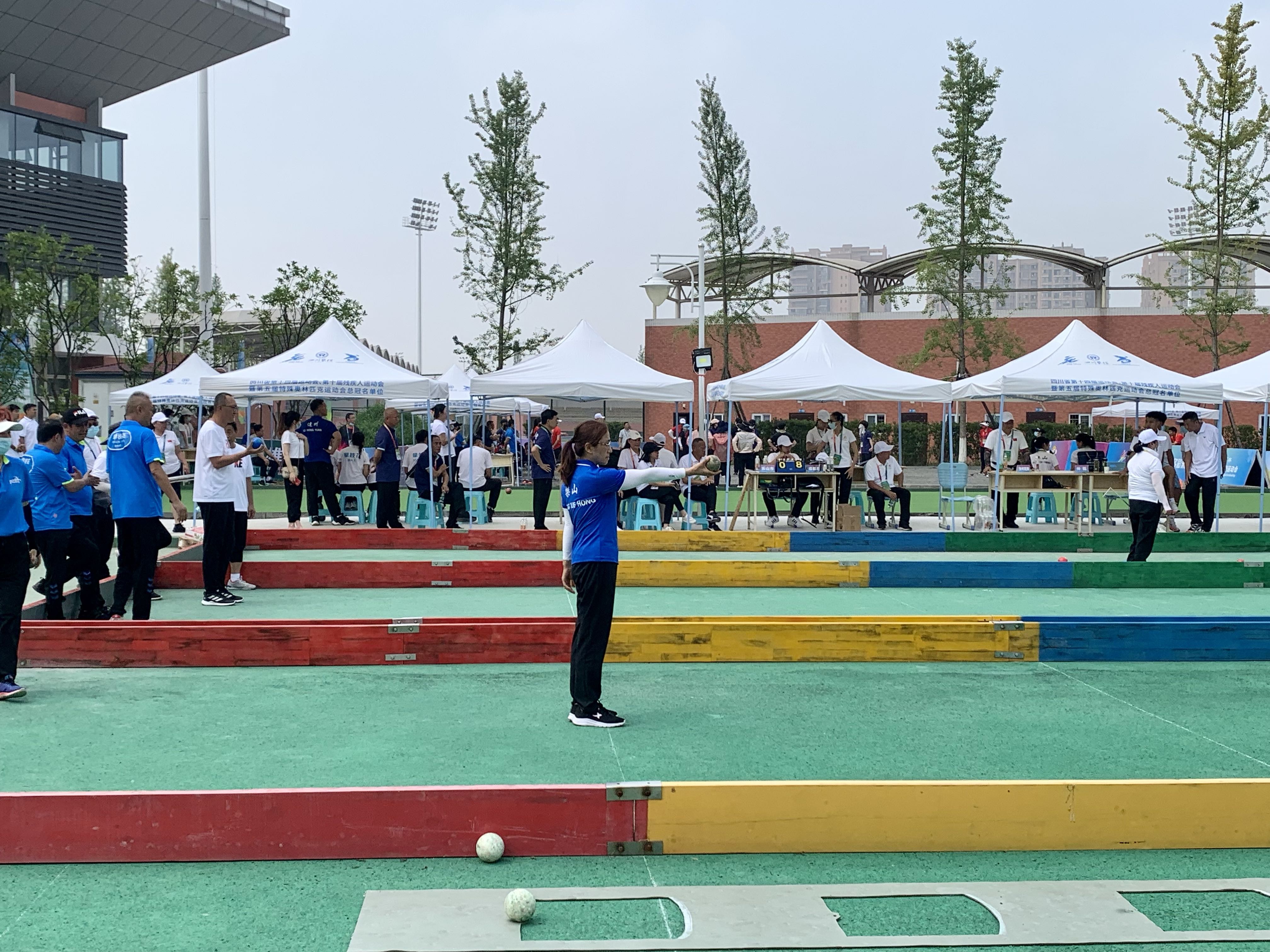 比赛现场,选手们沉着冷静,目光坚定,以优雅沉稳的姿势、坚定有力的动作将一颗颗球或滚或抛,大小球在赛场上划出优美的弧线,精准得分。