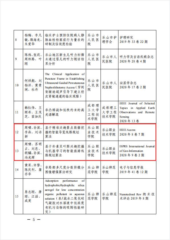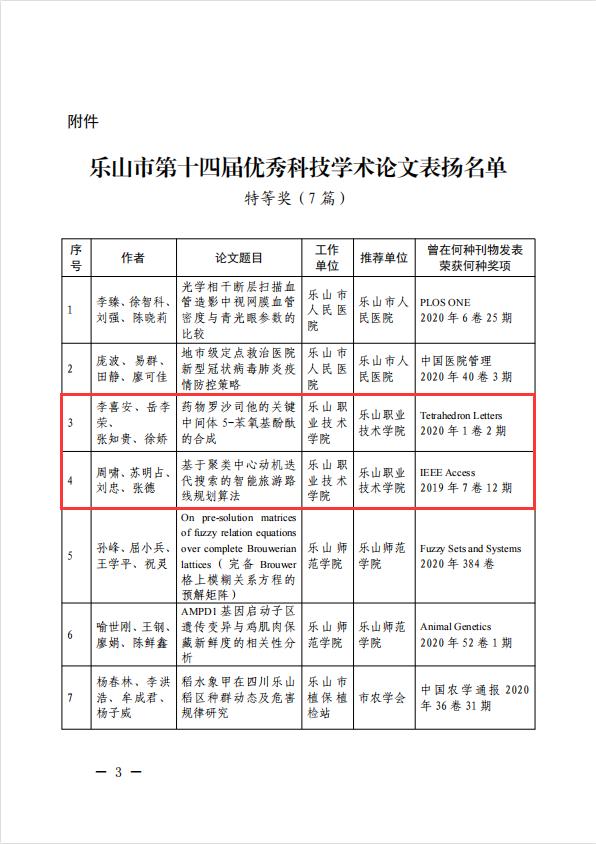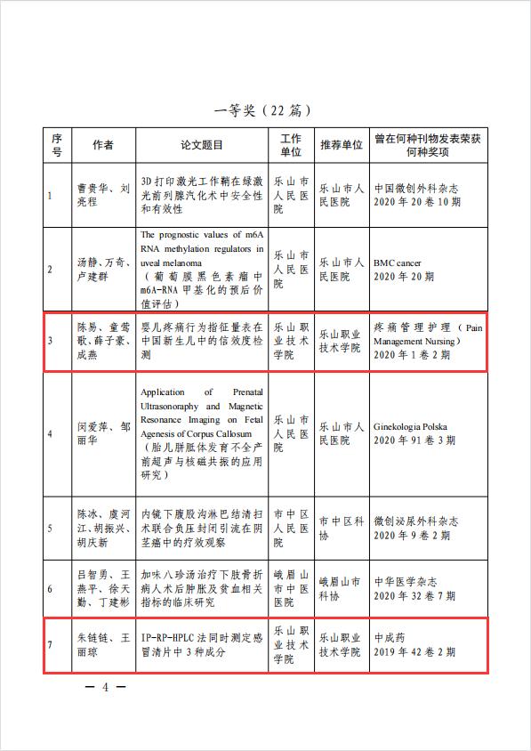 近日,经乐山市第十四届优秀科技学术论文专家评审组评审,beat365亚洲版官网的《药物罗沙司他的关键中间体 5-苯氧基酚酞的合成》、《基于聚类中心动机迭代搜索的智能旅游路线规划算法》2篇论文获特等奖,《婴儿疼痛行为指征量表在中国新生儿中的信效度检测》等5篇论文获一等奖。