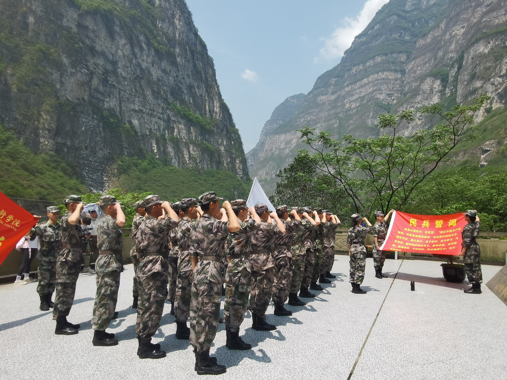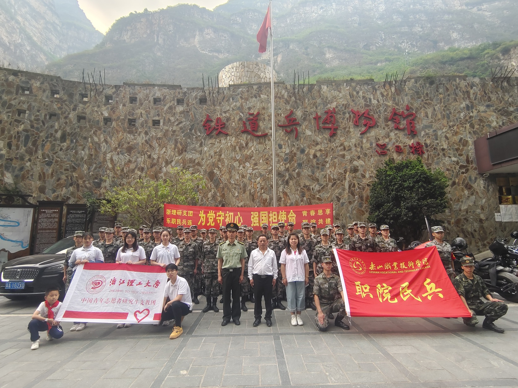 上午8时,民兵连队伍乘车出发,在金口河城区与浙理研支团四名支教志愿研究生会合后,于10点抵达铁道兵博物馆,下车后立即整装列队,有序进入主展馆,列队听取馆长王帮华讲解铁道兵修筑成昆铁路的历史。随后,队伍来到成昆铁路纪念碑广场,民兵连全体成员进行民兵誓词宣誓仪式,师生中的党员重温了入党誓词。