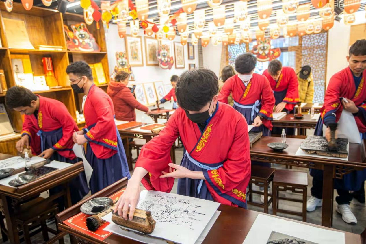 夹江木版年画是留学生们体验到的又一国家级非物质文化遗产,在老师讲述了拓印年画的基本要领后,留学生们小心、认真地操作起来。通过拓印的技法,他们都收获了一张有着美好虎年寓意的年画。