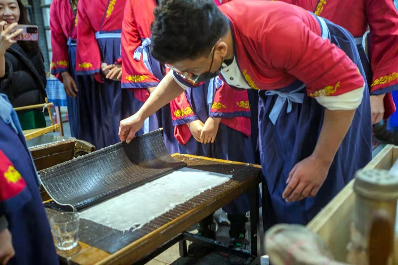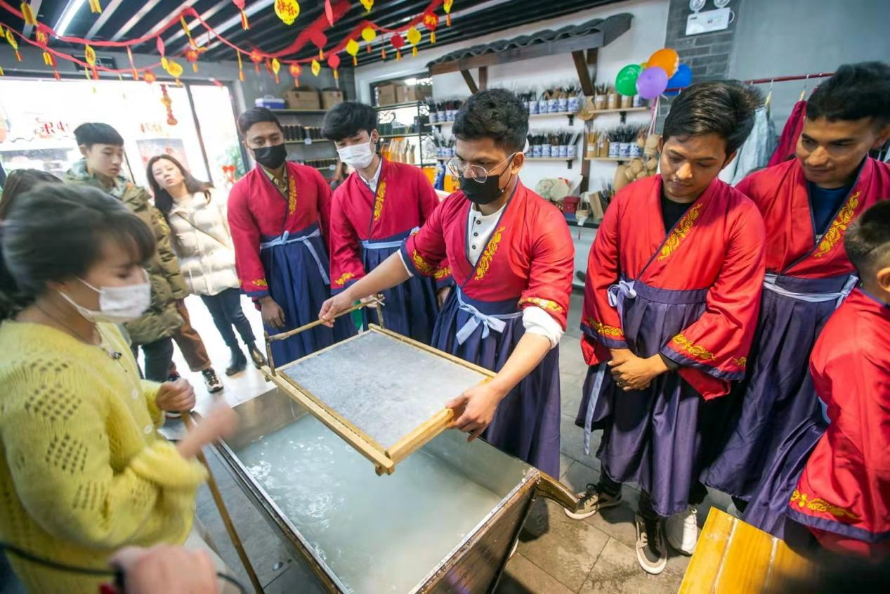 乐山夹江古法造纸技艺是国家级非物质文化遗产,在老师的介绍下,留学生们挽起衣袖打浆、舂捣、晾纸、揭纸……一套简易捞纸程序做下来,一张属于自己的“纸”就做好了,留学生们就此体会到了中国古人的智慧和技艺。