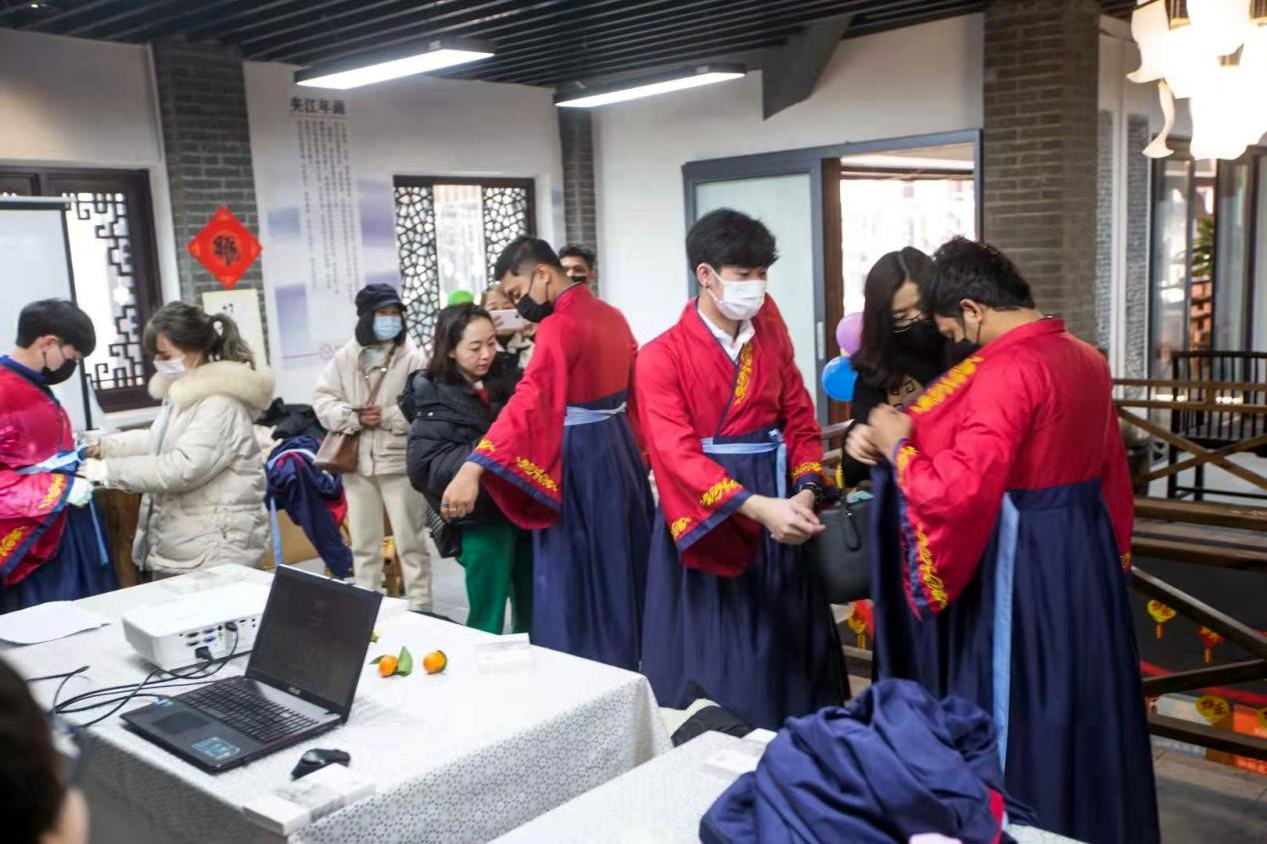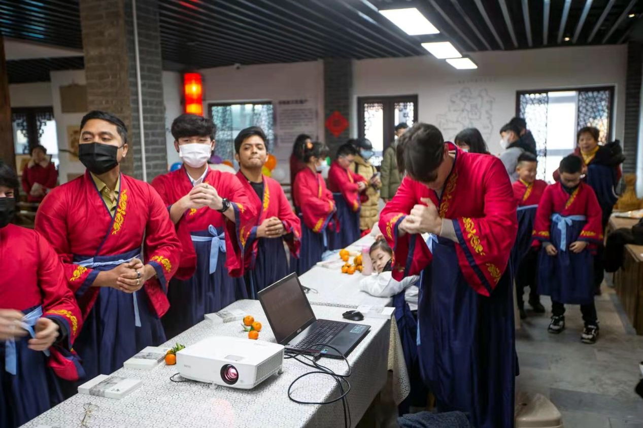 活动刚开始,在老师的带领下,留学生们了解了汉服的历史,随后留学生们穿上了汉服并学会了作揖的正确手势。
