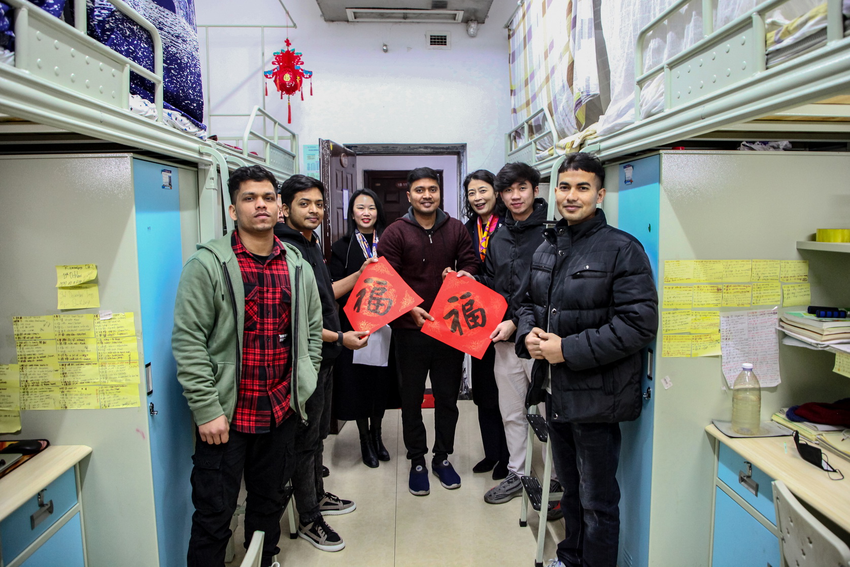 在学生宿舍,易群关切地询问留校国际学生的生活情况,并嘱咐宿舍管理人员要给予他们更多的关心。一句问候、一个“福”字,让留校的国际学生感受到了家的温暖和浓浓的中国年气氛。在食堂,易群在向师傅们表示慰问后,特别叮嘱管理人员要注意春节假期的消防安全和食品安全问题。