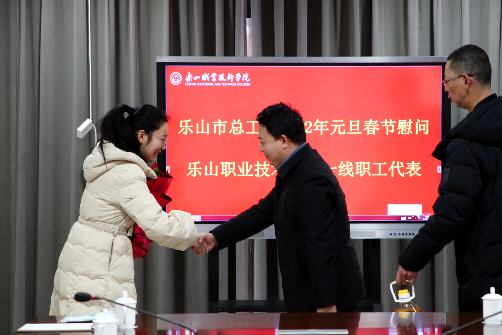 李欢代表乐山市总工会向大家致以新春的慰问,并希望通过教职工代表向全院教职工转达总工会的诚挚祝福。李欢说,你们一线教职工在培养技能人才,树立工匠精神,推动乐山经济发展中起着非常重要的作用。当前,乐山经济发展已经迈向了一个新的台阶,人民的生活水平不断提高,这些成绩的取得都离不开广大一线教师的辛勤付出,是你们为乐山各行各业输送了急需人才,在这里向大家道一声辛苦啦。慰问现场,气氛融洽,春意浓浓,参会的一线教师代表脸上都洋溢着幸福的笑容。