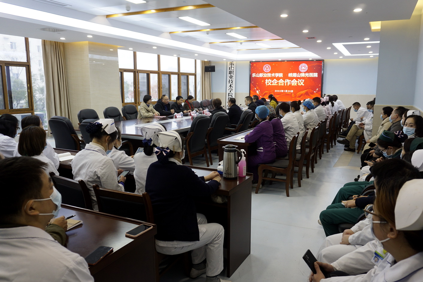 峨眉山佛光医院董事长杨烛、党支部书记兼院长张昌明、业务副院长柏萍、副院长朱磊、工会主席权渝及中层干部和部分技术骨干;beat365亚洲版官网副院长封家福,医护系主任张知贵、医护系副主任史良俊、医护系科长罗丹参加了本次会议。