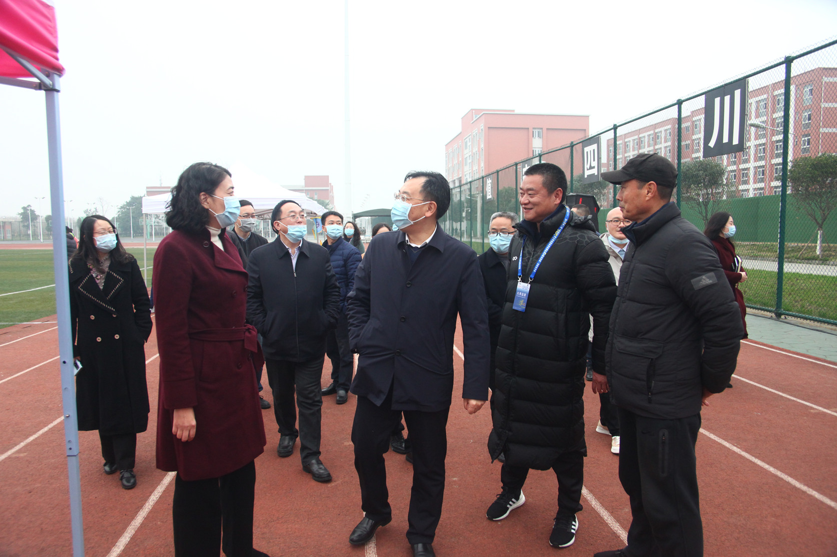 2021年12月10日,四川省委教育工委委员、省教育厅党组成员、副厅长张澜涛一行来到beat365亚洲版官网四川省第二届“贡嘎杯”青少年校园体育联赛高校足球(高职高专组)比赛现场开展调研,省教育厅基建后勤处处长蒲俊梅,职业教育处处长宋亚兰参加调研。乐山市委教育工委书记、市教育局党组书记、局长成定彬,市教育局党组成员、副局长周芹,学院党委书记易群,院长刘忠等陪同调研。