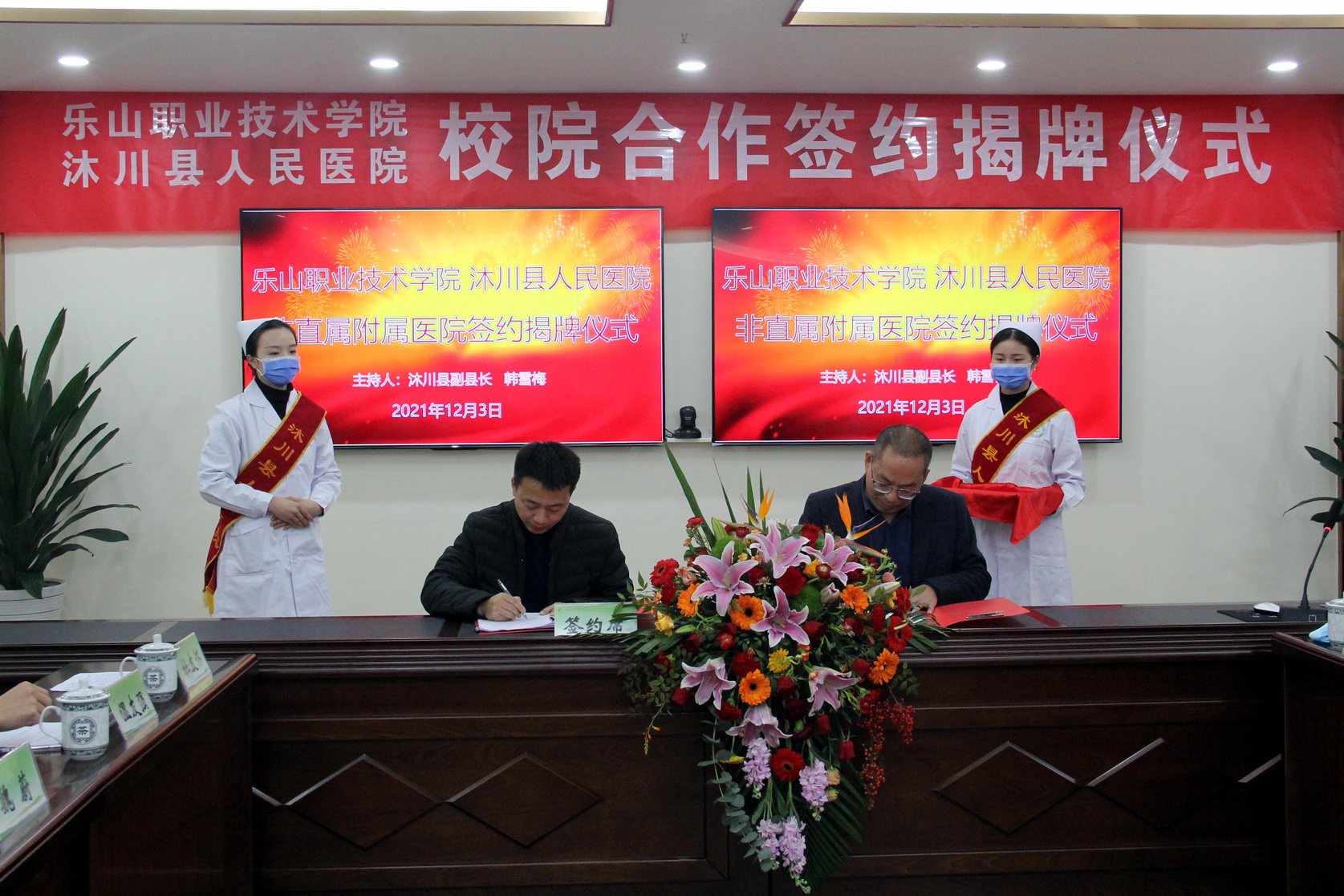 为贯彻落实教育部、财政部《关于实施中国特色高水平高职学校和专业建设计划的意见》精神, 坚持产教融合,实质推进协同育人,精准对接区域人才需求,推动高职院校和行业企业形成命运共同体,本着资源共享、互利互惠的原则,2021年12月3日,学院党委书记易群带队一行7人赴沐川县人民医院签约“非直属附属医院”并揭牌。