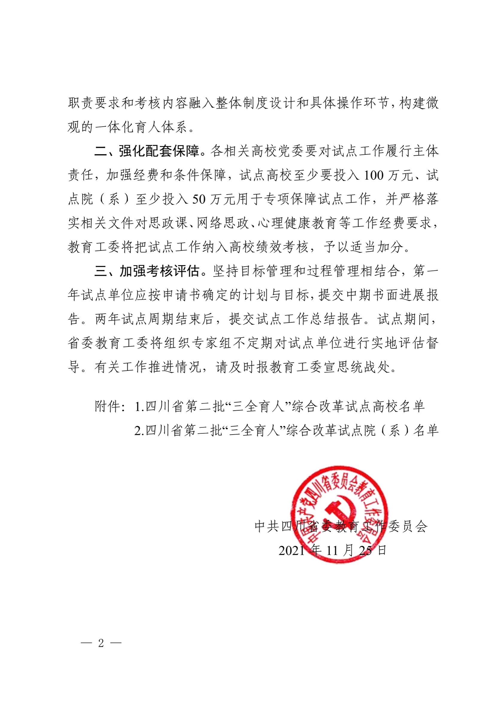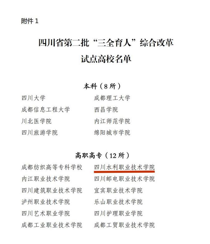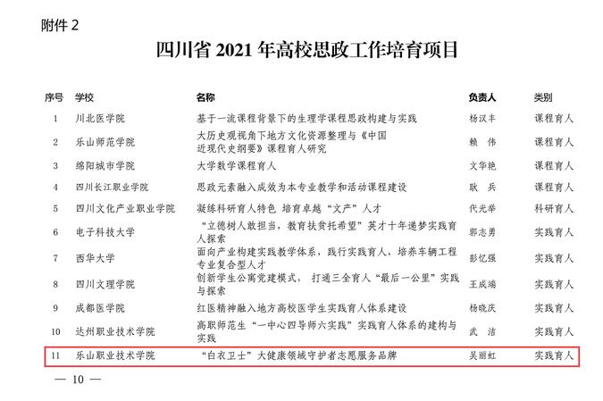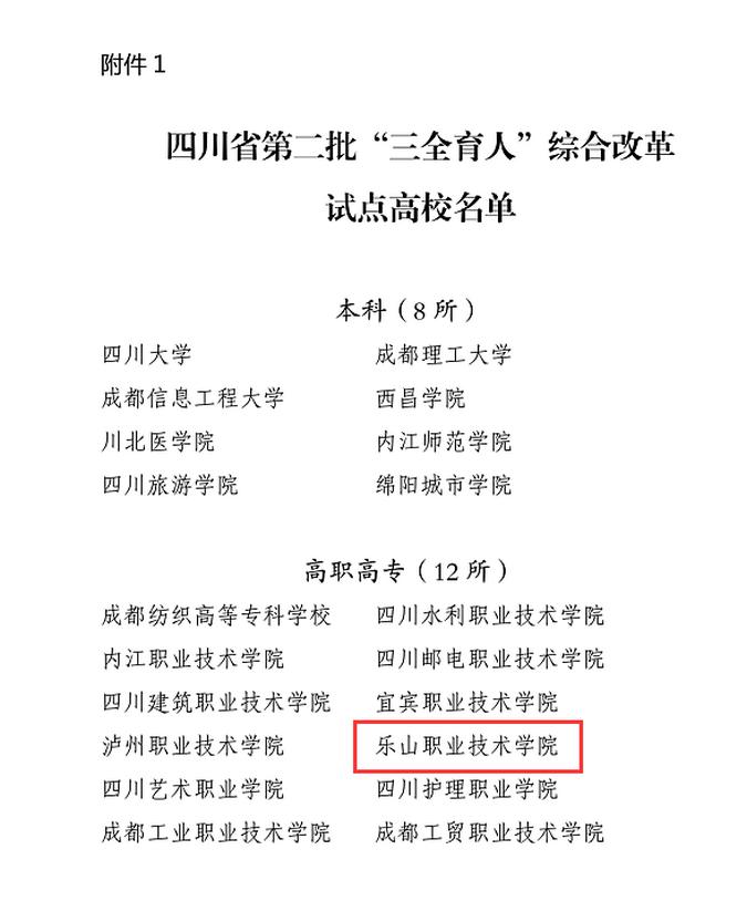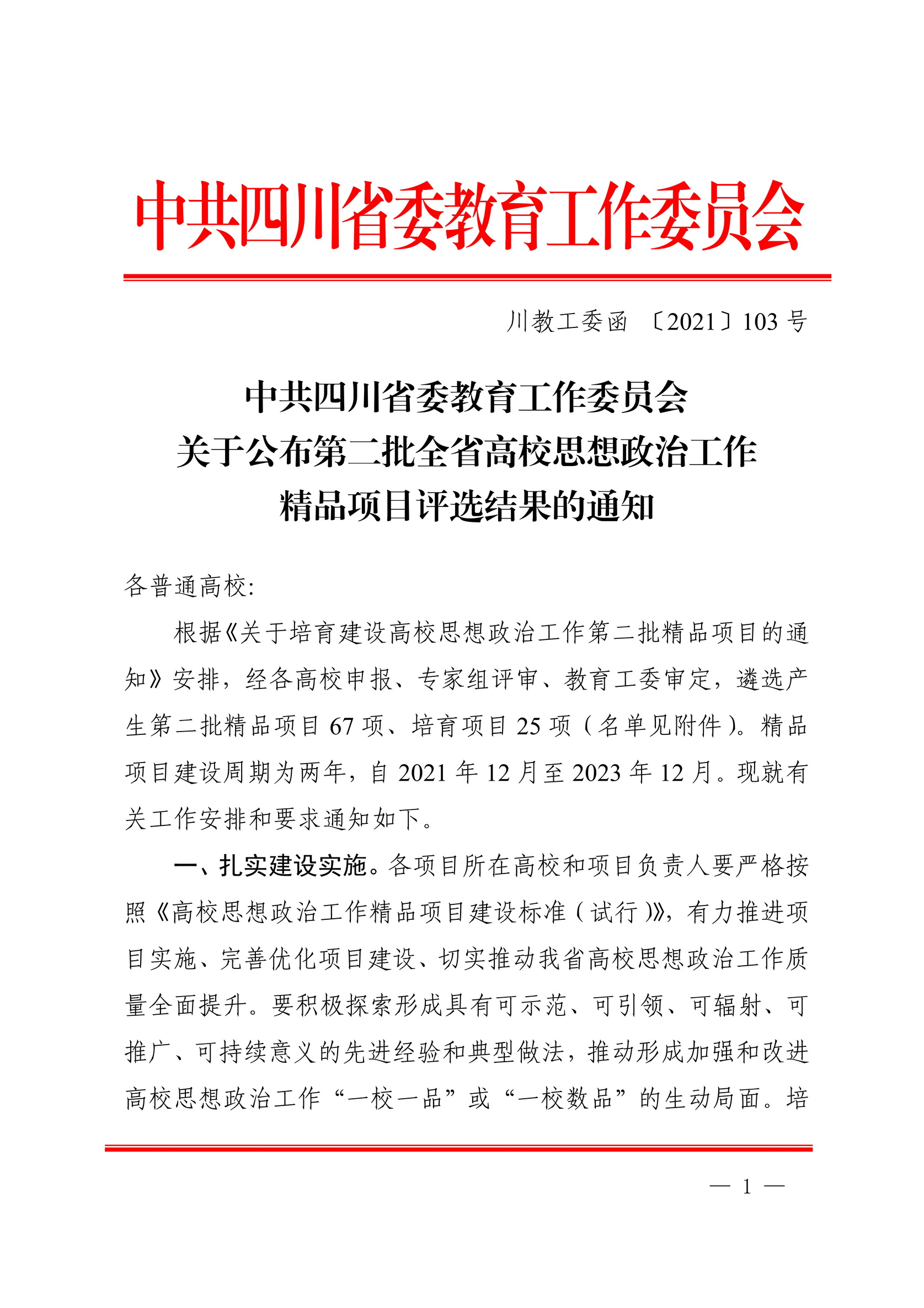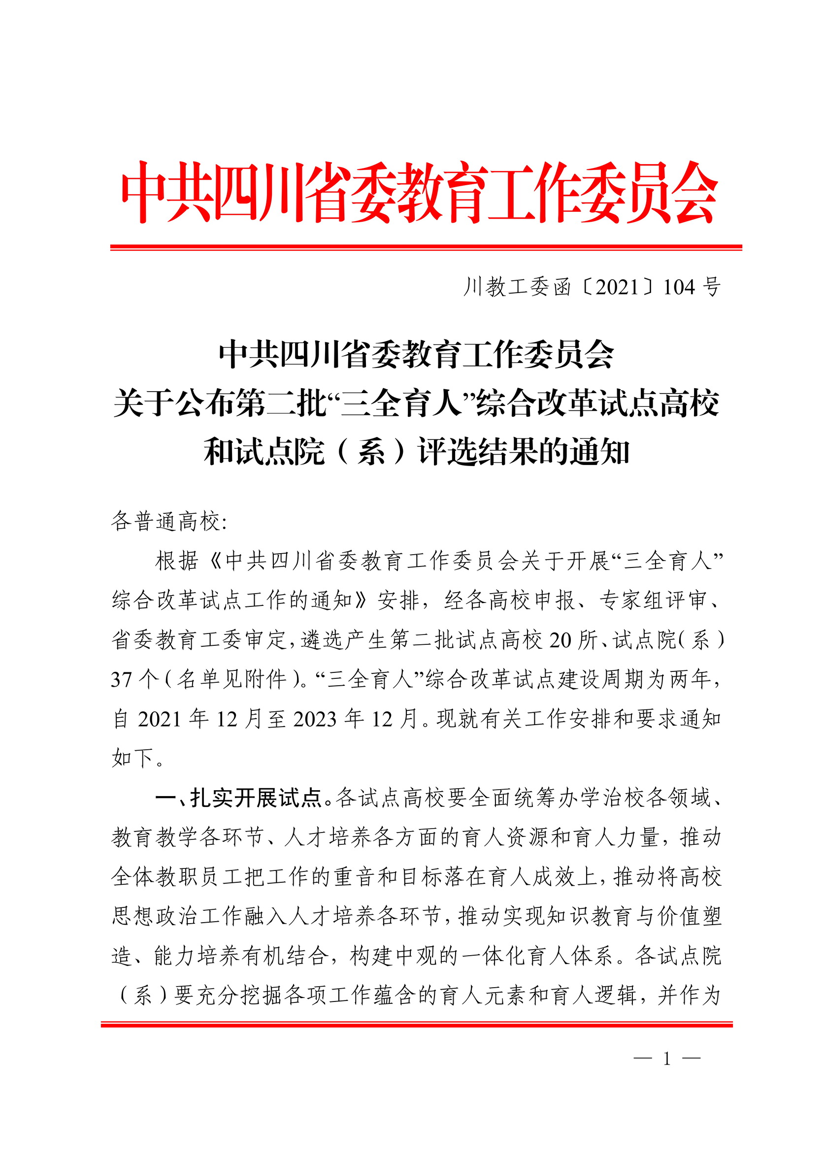 值学院办学70周年之际,根据省委教育工委相关文件精神,我院“三全育人”思想政治工作在省级领域取得重大突破。学院获批第二批省级“三全育人”综合改革试点高校、新能源工程系获批第二批省级“三全育人”综合改革试点院(系)、护理系实践育人项目获批四川省2021年高校思政工作培育项目。