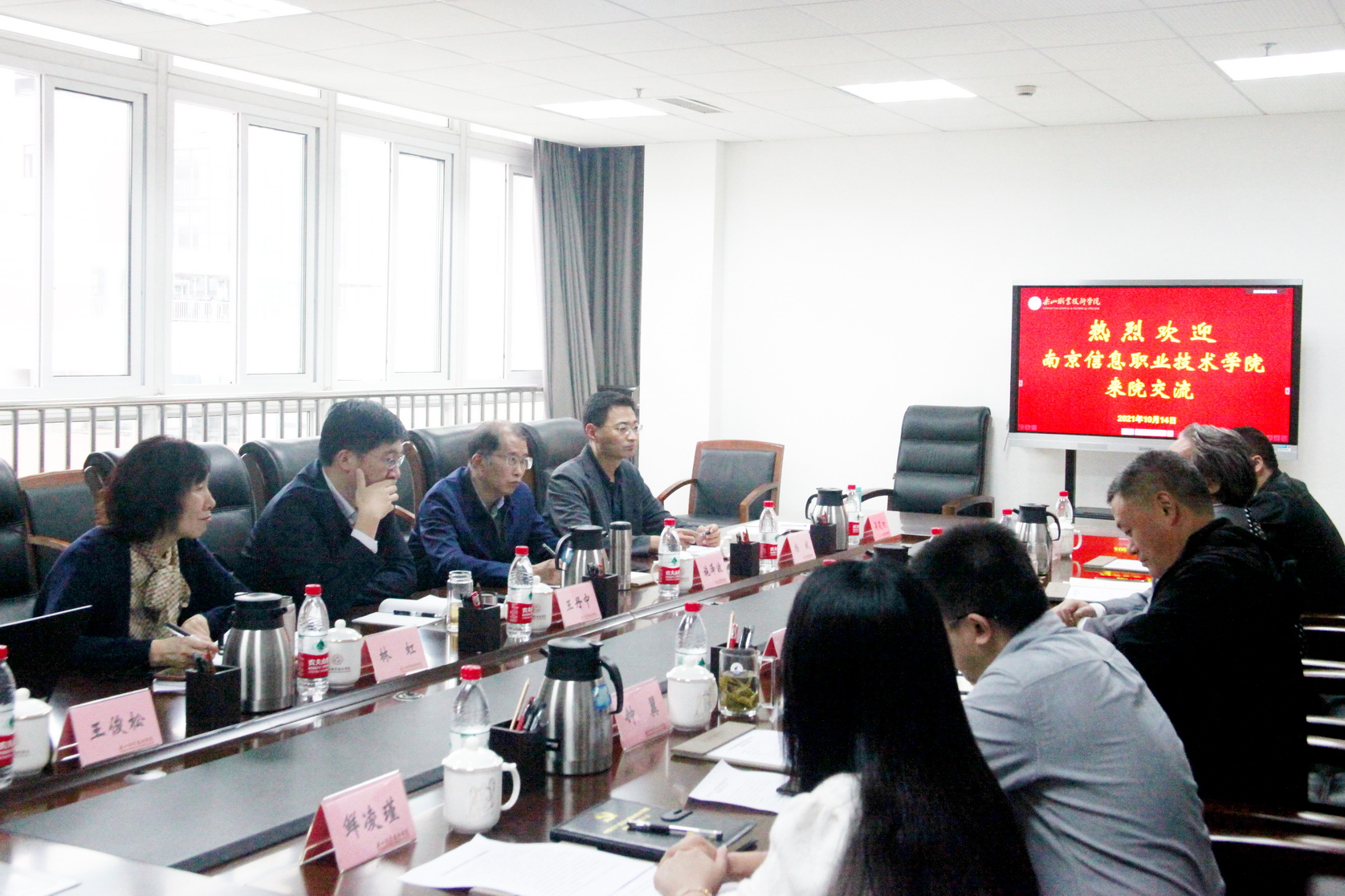 2021年10月15日,南京信息职业技术学院党委书记王丹中,党委副书记、纪委书记施泽波一行来院交流,学院党委副书记陈芝海,党委委员、纪委书记李昌贵以及相关部门负责人参加了座谈交流会。
