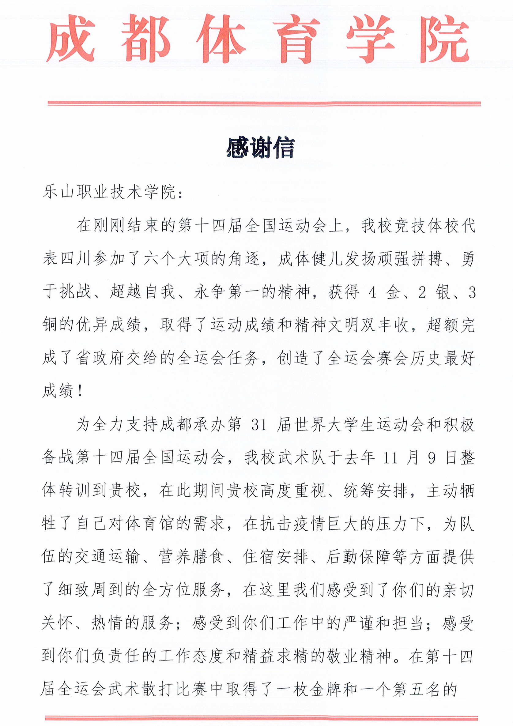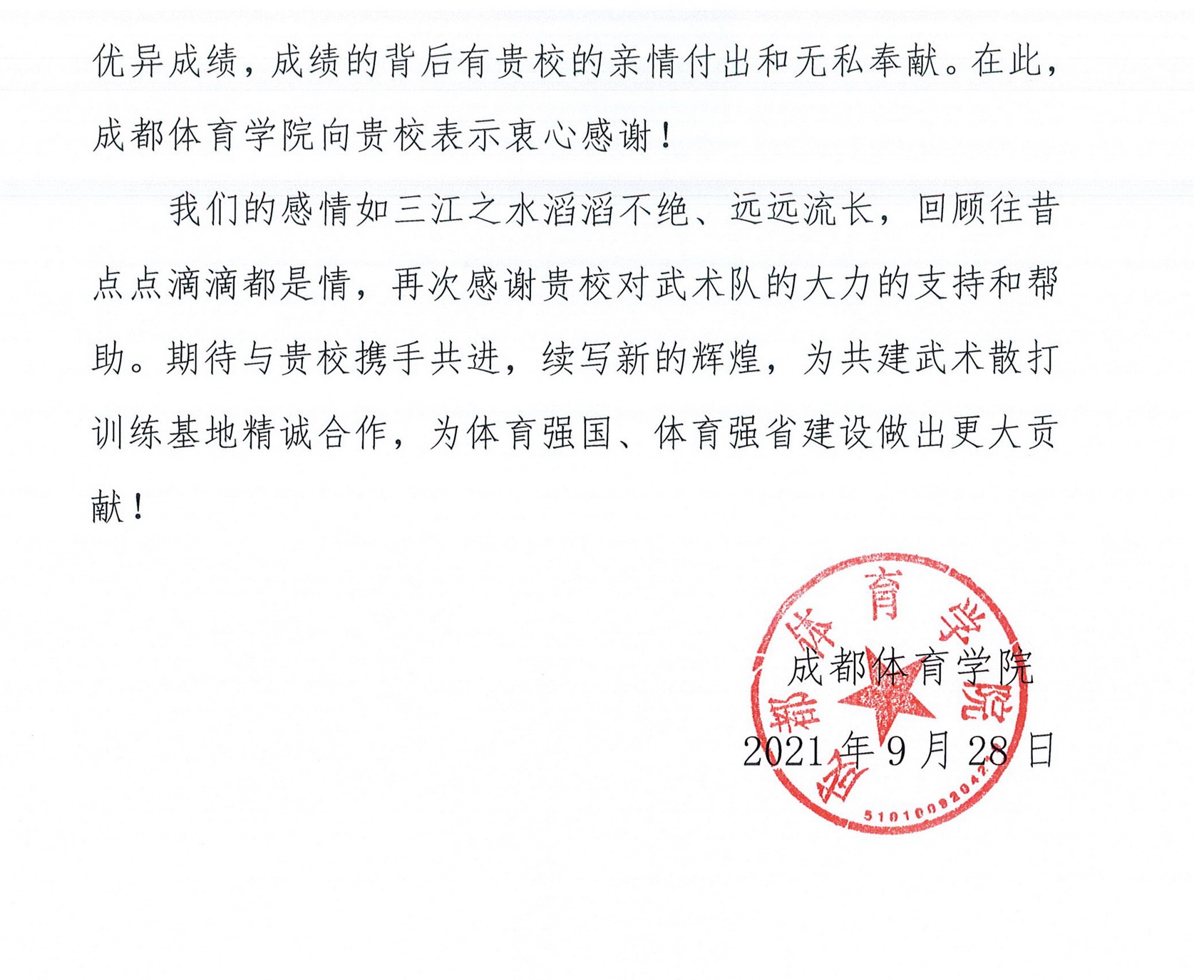 2020年11月,成都体育学院组建的四川省武术散打队进驻学院峨眉武院青江基地,为征战2021年第十四届全国运动会进行了大半年的封闭式训练。在此期间,学院对这支队伍提供了无微不至的后勤保障。今年全运会上,成体健儿获得4金、2银、3铜的佳绩,超额完成省政府交给的全运任务。国庆前夕,成都体育学院给学院发来一封感谢信。大家快来看看吧。