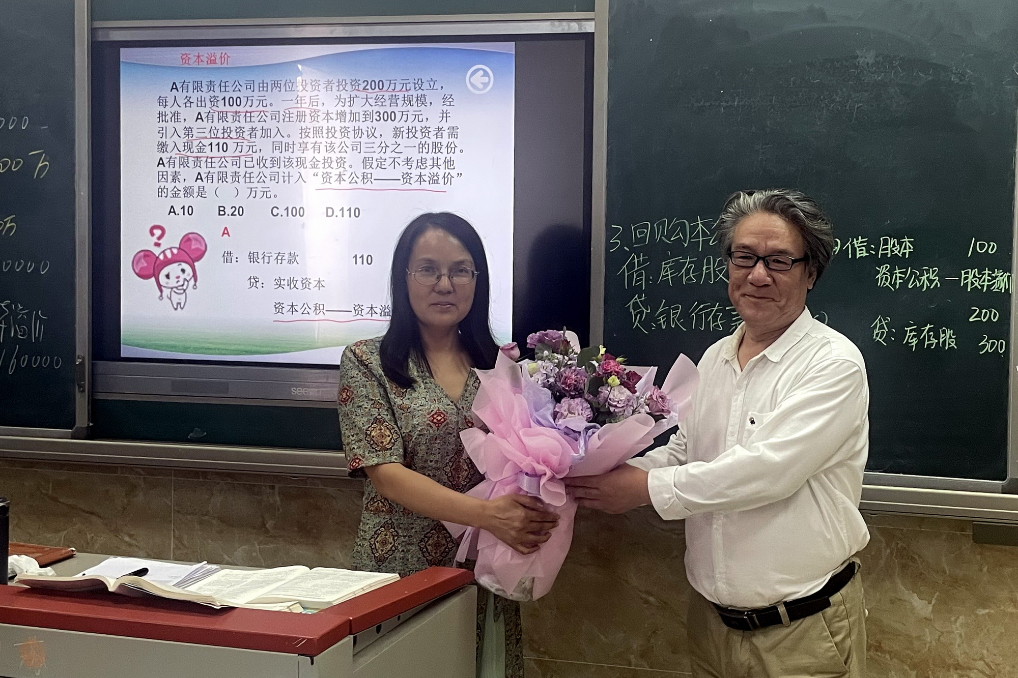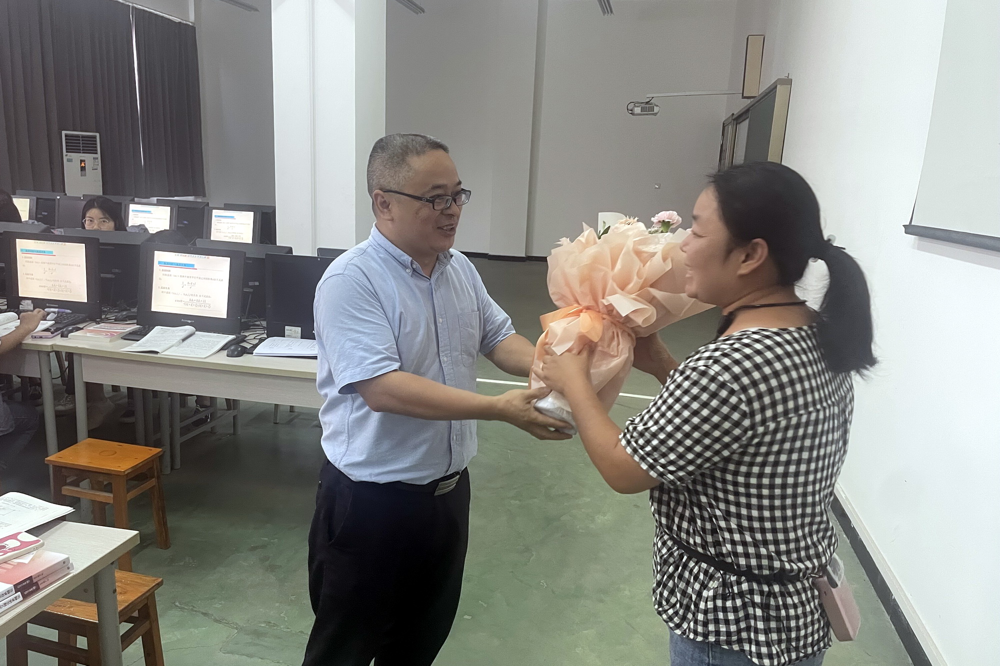“鲍老师,您辛苦了,节日快乐!” 9月10日教师节一早,学院党委书记易群走进了4号实训楼306教室,将手里捧的一束鲜花递给了财经管理系青年教师鲍敏的手中。“好漂亮呀!没想到教师节当天能收到易书记送的鲜花,太惊喜了。”鲍老师开心地接过易书记送的鲜花,同学们也及时献上了祝福的掌声。