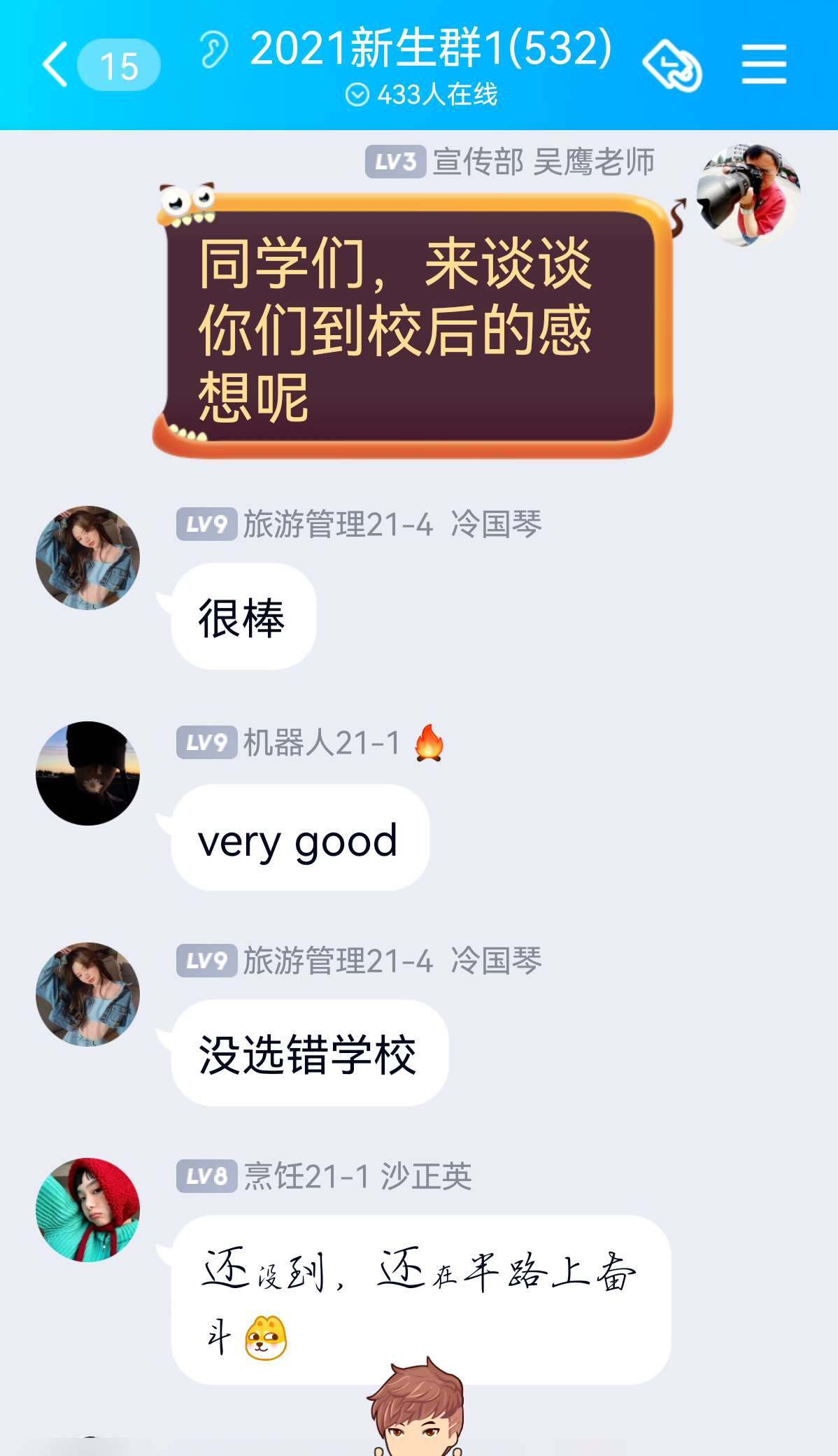 学院热情周到的服务给“萌新”们留下了极好的印象,在新生群里,同学们纷纷用他们的方式表达了称赞。“一级棒”“奥利给”“没有选错学校”……这些洋溢着青春气息的话语,还有各种点赞的表情包,是对今年学院迎新工作最好的肯定。