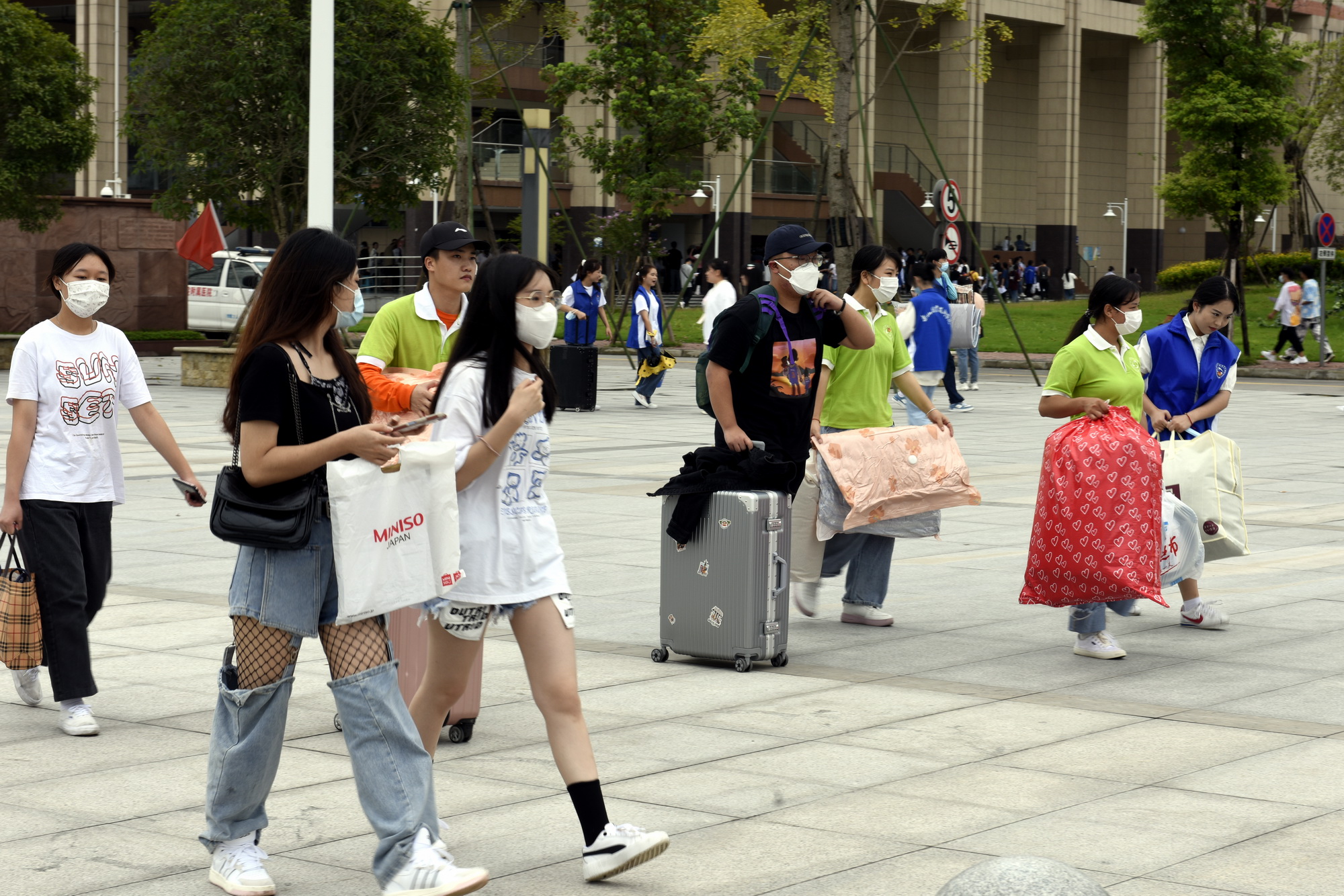 校园内,校歌《年轻的太阳》和各种歌曲循环播放,音乐喷泉有节奏地舞蹈,志愿者热情答疑解惑、陪同新生,服务车辆协助新生搬运行李,各色指示牌、横幅标语更是将气氛烘托得无比热烈……