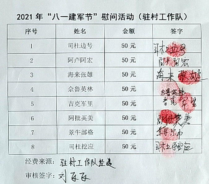 本次活动共计慰问8人,每人发放50元慰问金,共计400元,外出务工的同志由家属代领。本着“慰问一人、温暖一户、带动一片”的原则,让关怀和荣誉进入大家内心。