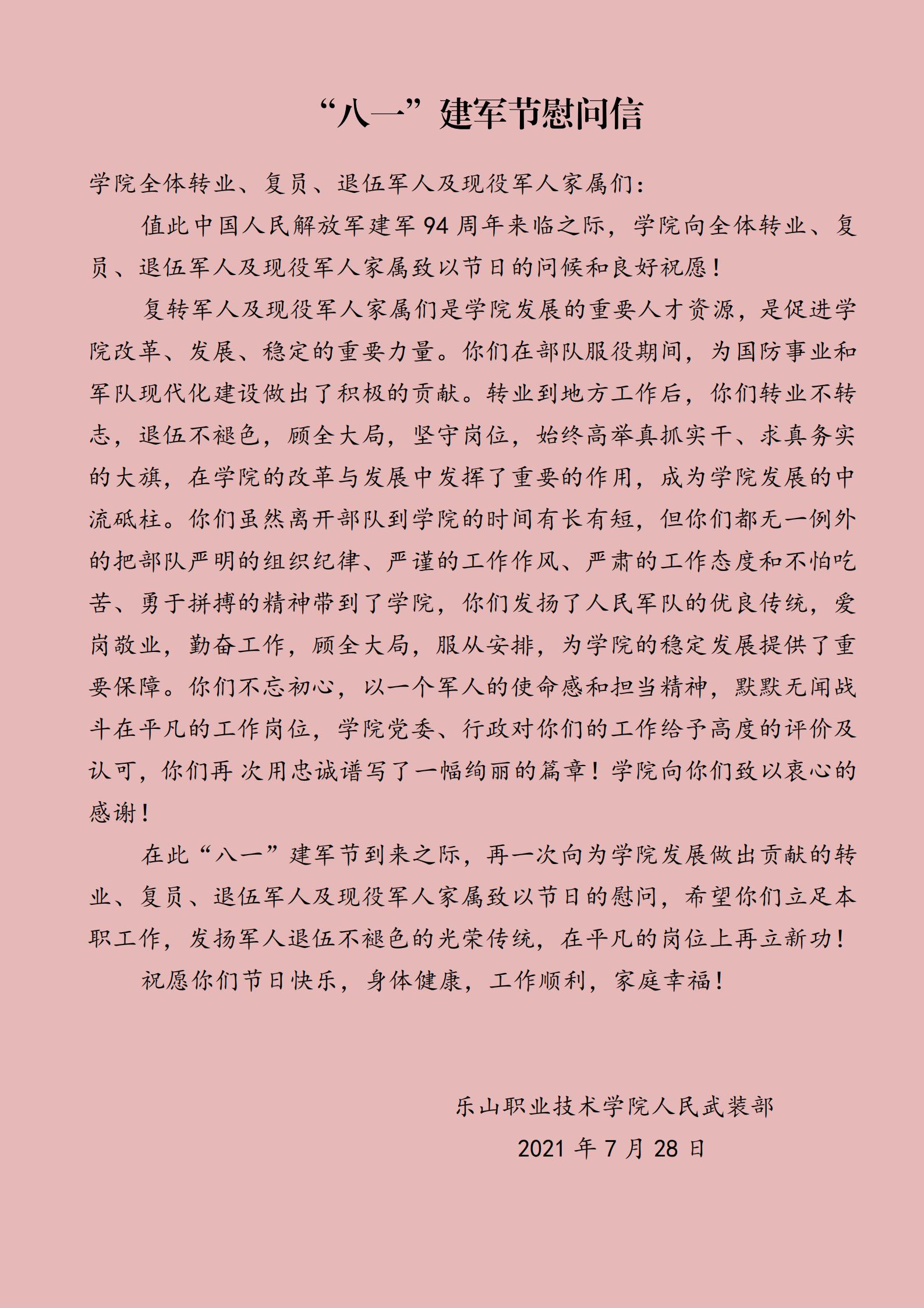 值此八一建军节到来之际,再一次向为学院发展做出贡献的转业、复员、退伍军人及现役军人家属致以节日的慰问,希望你们立足本职工作,发扬军人退伍不褪色的光荣传统,在平凡的岗位上再立新功!