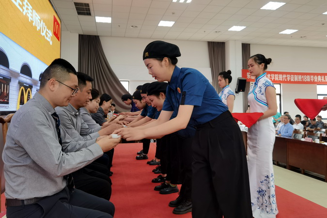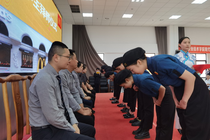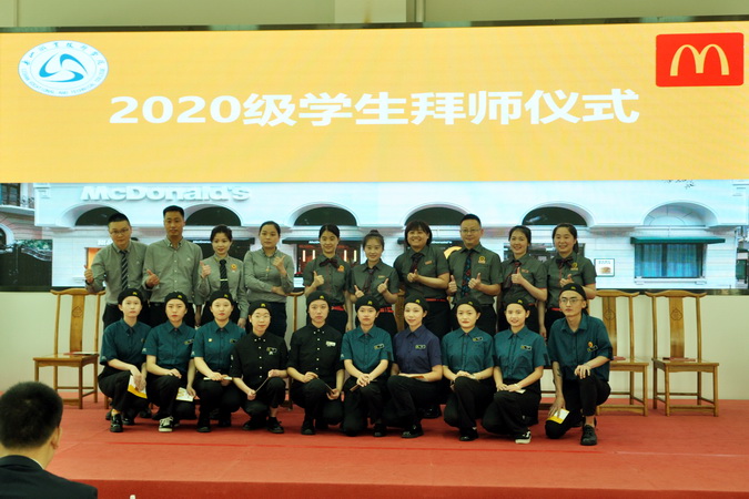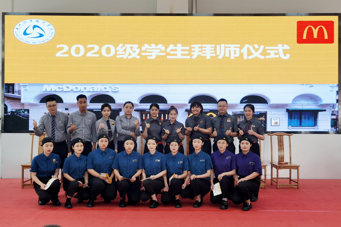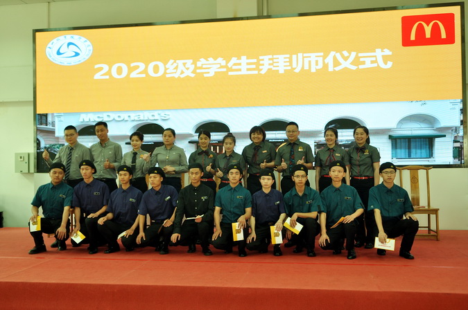 在2020级新学徒的拜师仪式上,来自麦当劳公司的师父们上台入座、学徒依次登台拜师,向师父敬献拜师帖、奉上拜师茶、躬行拜师礼,师父则郑重地为徒弟佩戴工牌并赠以《学徒版-现代学徒制手册》。学徒们庄重宣誓,立志不负企业、学院和社会的期望,不忘初心、砥砺前行,德技并修、精进技艺,不负韶华。
