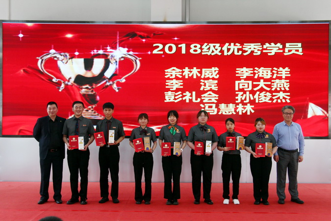 2018级优秀学徒代表彭礼会发言,对学院与企业提供的平台,老师、师傅的培养表达了由衷的感谢,秉承栉风沐雨、薪火相传共同成长。学院与企业领导为毕业生颁发了毕业证和聘书,并对优秀学生进行了表彰。