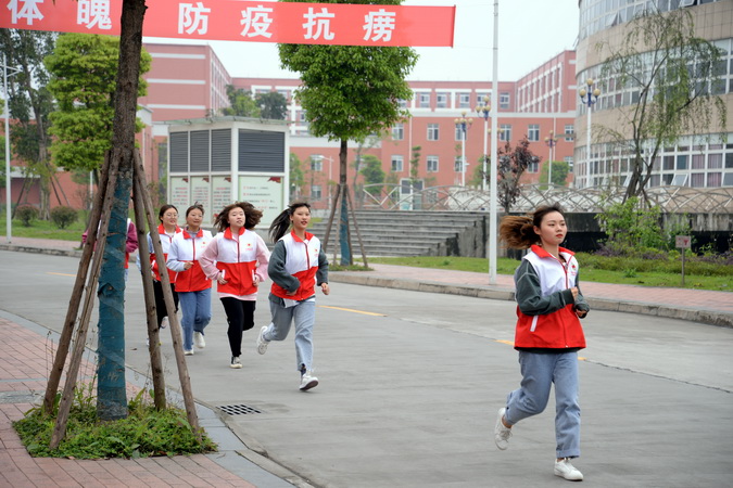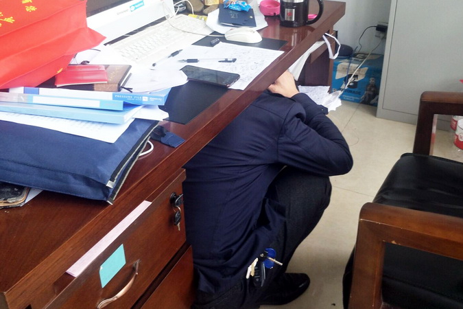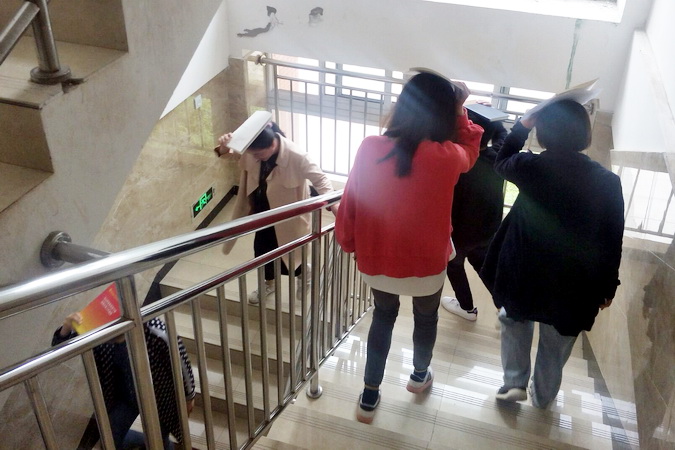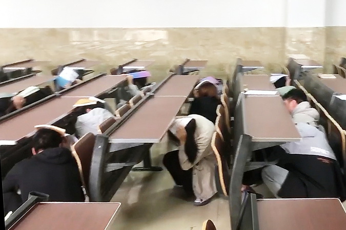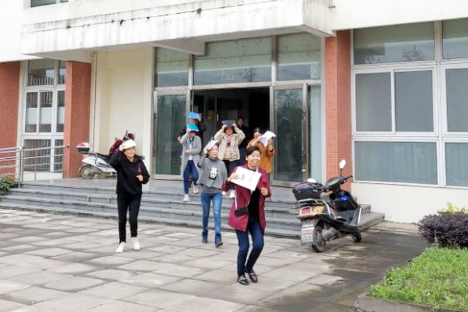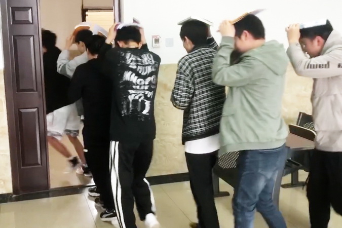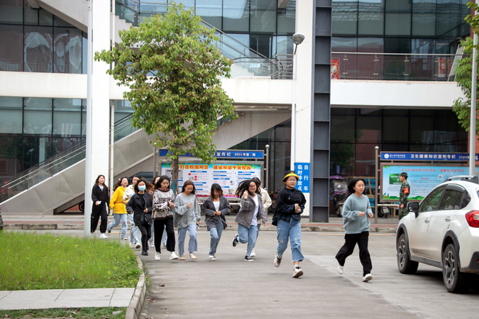 下午2.10分,全院广播警报骤然响起,师生们第一时间从各建筑物往外紧急撤离,高楼层的迅速利用墙角、办公桌、课桌、卫生间进行躲避。各楼宇内1楼的人员以最快的速度第一时间单手拿遮挡物保护头部,迅速逃离建筑物到达就近避难点(建筑物外空旷地带),然后迅速向紧急避难区(主运动场)疏散。2楼及2楼以上的人员迅速寻找狭小空间和容易形成三角生存空间的位置进行躲避,在教室、图书馆的人员,远离窗口躲避在书桌旁边或下面;在礼堂、食堂、体育馆内的人员,躲避在承重墙的墙根、墙角、稳固的书架、排椅、桌椅、运动器具旁边或下面;在宿舍的人员,躲避在卫生间、床下面或旁边;在室外人员,迅速远离可能倒塌的建筑物和容易跌落的大型物件等地带。