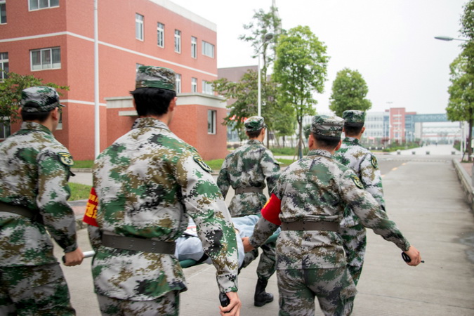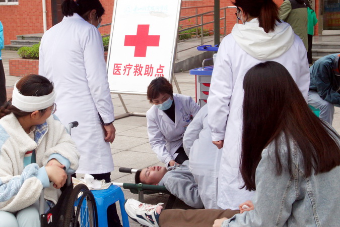 学院民兵连、红十字急救小分队迅速集结,充当最美逆行者,返回学生宿舍各楼栋进行搜救。经过搜救,发现两名学生“轻伤”、一名学生“重伤”,轻伤员被搜救人员搀扶到空旷地带简单包扎,重伤员被民兵连突击队员用担架紧急送到卫生所外临时搭建的医疗救助点,救助点医护人员对伤员进行急救处理后,联系120救护车送往医院……