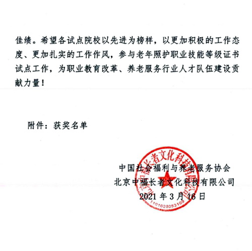 近日,学院收到中国社会福利与养老服务协会《关于对2020年度教育部1+X老年照护职业技能等级证书试点院校(西南部片区)进行表彰的决定》,决定授予beat365亚洲版官网老年照护职业技能等级证书试点工作“突出贡献奖”。