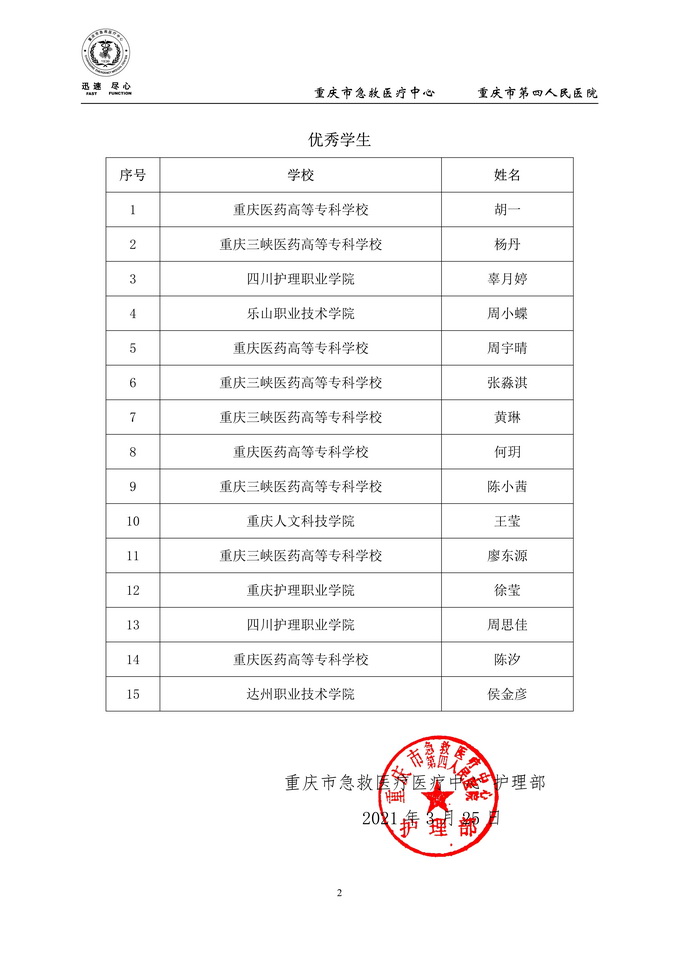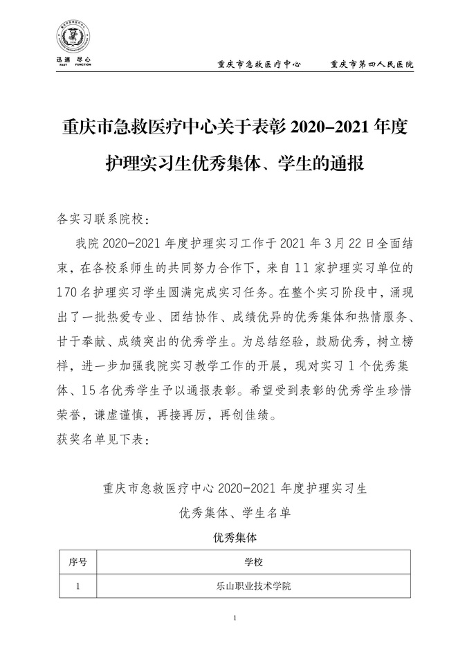 重庆市急救医疗中心护理部来函,将beat365亚洲版官网实习生评为“2020-2021 年度护理实习生优秀集体”,周小蝶被评为“优秀学生”。