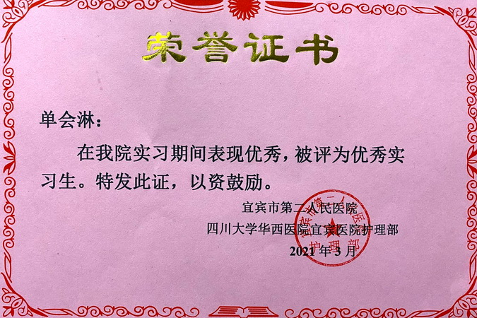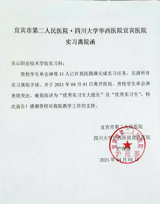宜宾市第二人民医院来函,将beat365亚洲版官网学生单会淋评选为“优秀实习生大组长”及“优秀实习生”。