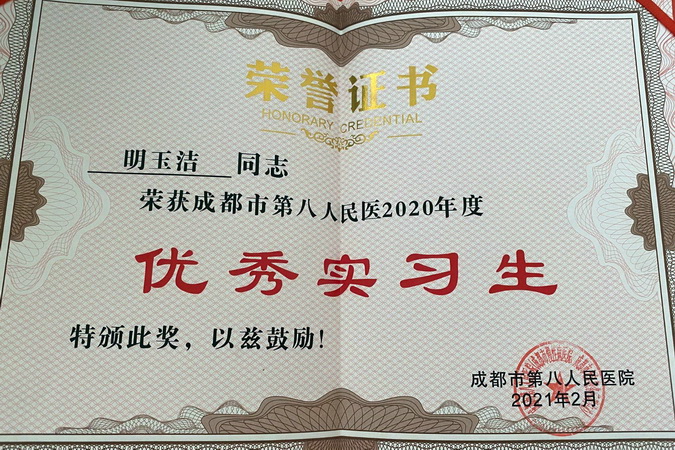 成都市第八人民医院和富顺县人民医院则分别授予明玉洁和舒金秀两位同学“优秀实习生”荣誉证书。