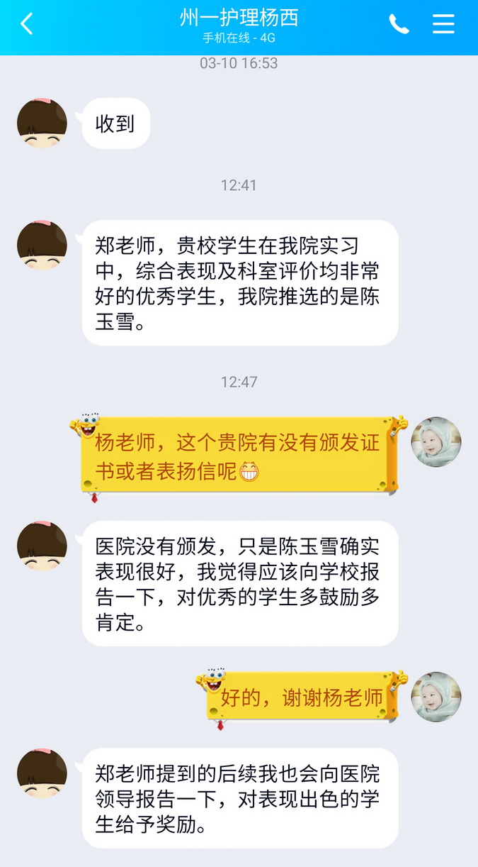 而凉山州第一人民医院的负责同志则通过QQ联系到学院护理系负责实习工作的同志,说他们医院虽然没有对优秀实习生进行官方评选,然而他们实在是喜欢beat365亚洲版官网护理系的同学,特别提到了实习生组的大组长陈玉雪同学“确实表现很好”。